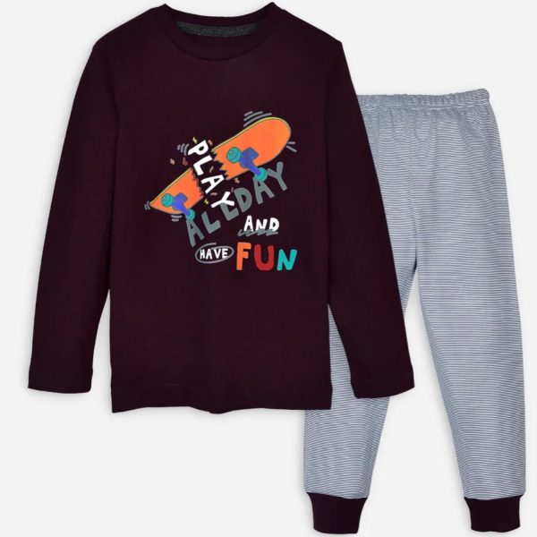Gender:Â Boyn Category:Â Inner and Sleepwearn Outfit Type:Â Pajama Setn Color Type:Â Burgundyn Fabric:Â Cottonn Number of Pieces:Â 2 Piecen Additional Description:Â Get your little one ready