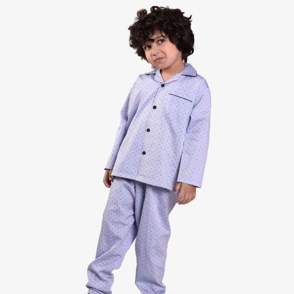 Gender:Â Boyn Category:Â Inner and Sleepwearn Outfit Type:Â Pajama Setn Color Type:Â Bluen Fabric:Â Cottonn Number of Pieces:Â 2 Piecen Disclaimer:Â Actual product color may vary slightly