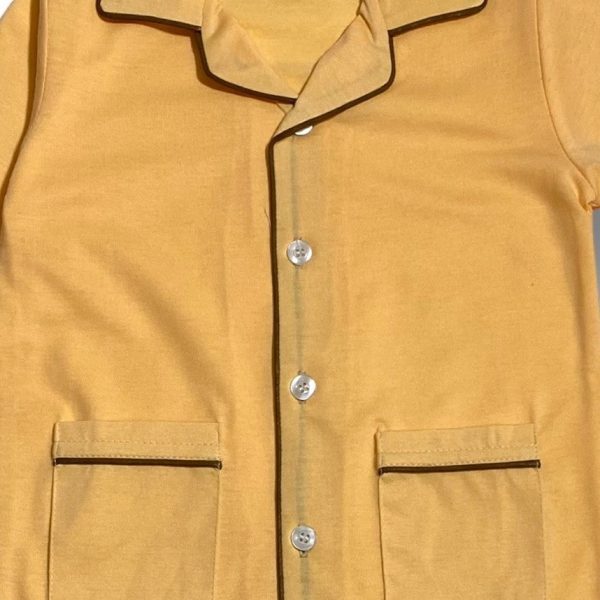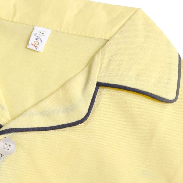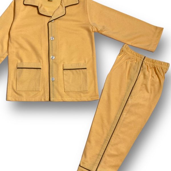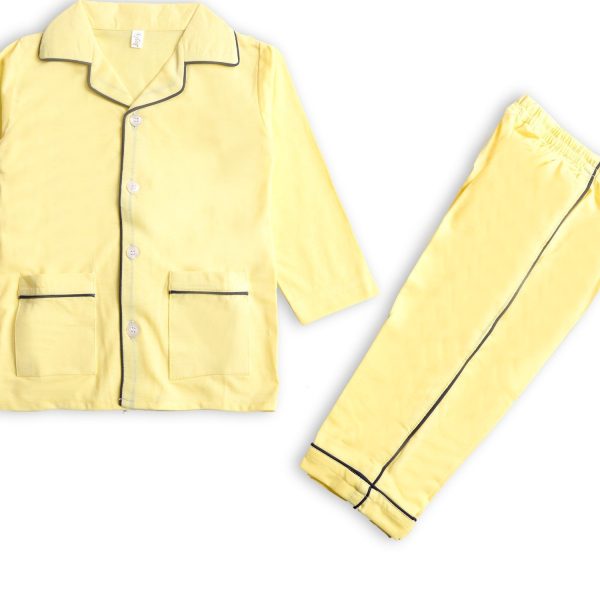 Gender:Â Boyn Category:Â Inner and Sleepwearn Outfit Type:Â Pajama Setn Color Type:Â Butter Yellown Fabric:Â Cottonn Number of Pieces:Â 2 Piece – Top & Bottomn Disclaimer:Â Actual