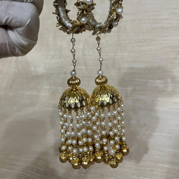 Gender:Â Girln Category:Â Accessoriesn Outfit Type:Â Jewelryn Sub-Category:Â Banglesn Color Type:Â Floral Whiten Number of Pieces:Â 2 Piecen Additional Description:Â KALEERA:nTraditional bangles with hangings that are commonly