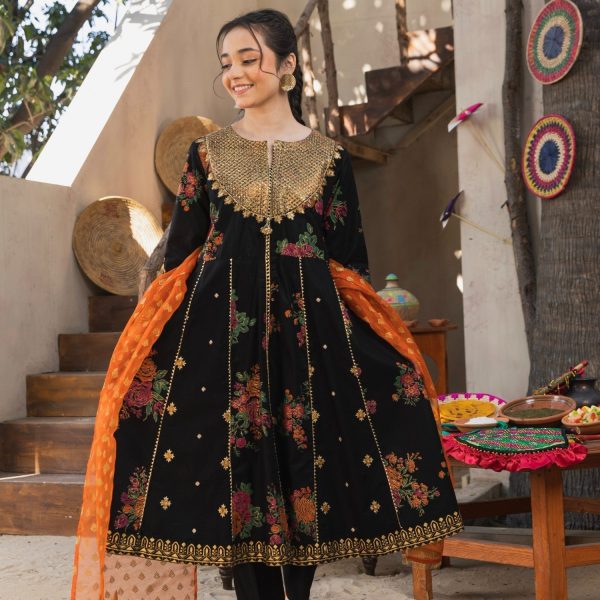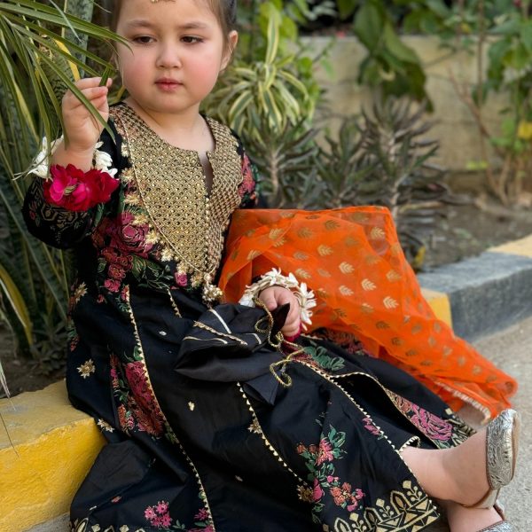 Gender:Â Girln Category:Â Clothingn Outfit Type:Â Easternn Sub-Category:Â Pishwasn Bottom Style:Â Straight Trousern Color Type:Â Blackn Dupatta Fabrics:Â Organzan Number of Pieces:Â 3 Piece – Top + Bottom