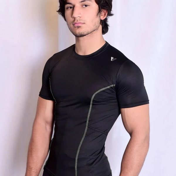 Gender:Â Menn Category:Â Clothingn Outfit Type:Â Activewearn Sub-Category:Â T Shirtn Color Type:Â Blackn Fabric:Â Spandexn Number of Pieces:Â 1 Piecen Additional Description:Â Includes: T ShirtnnFabric: Polyester SpandexnnWork Technique: