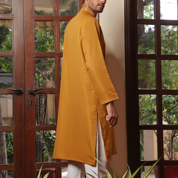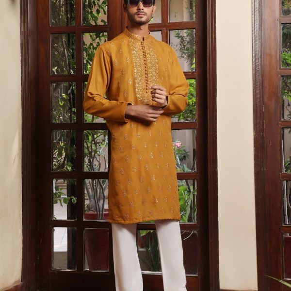 Gender:Â Menn Category:Â Clothingn Outfit Type:Â Easternn Sub-Category:Â Kurta Setn Bottom Style:Â Straight Trousern Color Type:Â Mustardn Fabric:Â Raw Silkn Number of Pieces:Â 2 Piece – Top &