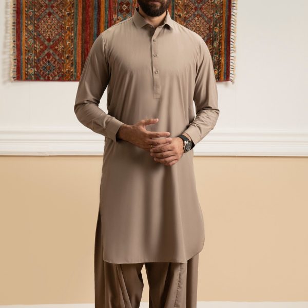 Gender:Â Menn Category:Â Clothingn Outfit Type:Â Easternn Sub-Category:Â Shalwar Kameezn Bottom Style:Â Pleatedn Color Type:Â Beigen Fabric:Â Poly Viscosen Number of Pieces:Â 2 Piece – Top & Bottomn