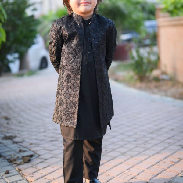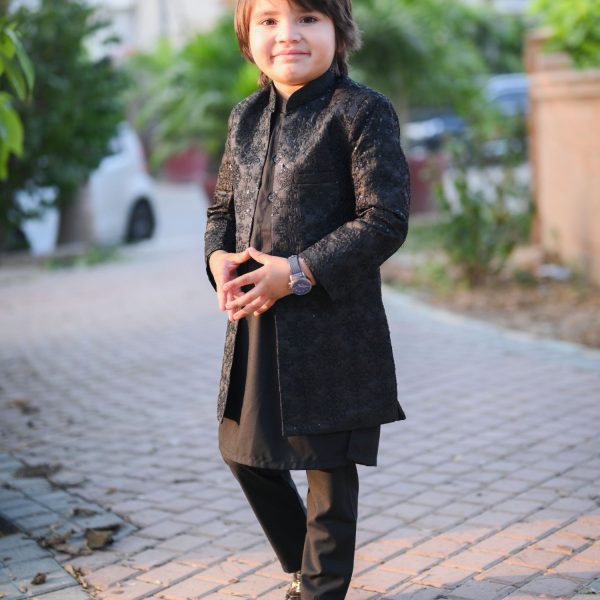 Gender:Â Boyn Category:Â Clothingn Outfit Type:Â Easternn Sub-Category:Â Sherwanin Color Type:Â Blackn Fabric:Â Jamawarn Number of Pieces:Â 3 Piecen Product Type:Â Festive/Party Wearn Season:Â All Seasonn Additional Description:Â his black