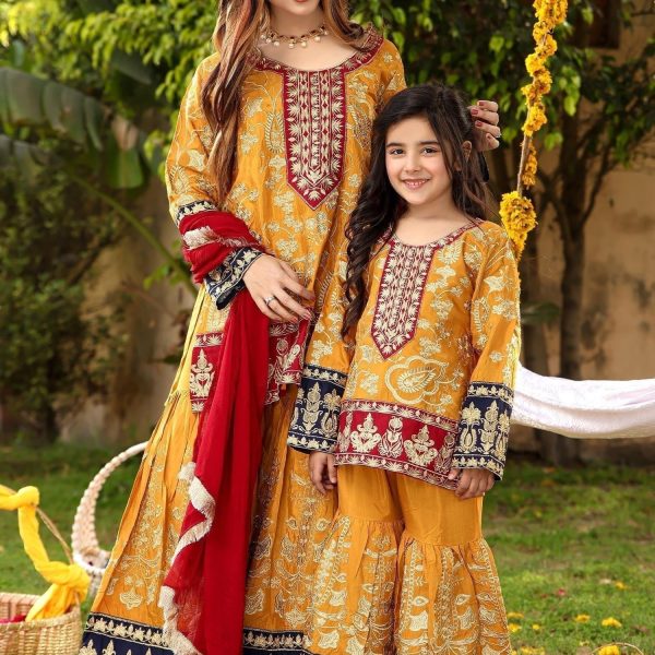 Gender:Â Womenn Category:Â Clothingn Outfit Type:Â Eastern Ready to wearn Sub-Category:Â Ghararan Bottom Style:Â Wide-Leg Ghararan Color Type:Â Mustardn Dupatta Fabrics:Â Chiffonn Number of Pieces:Â 3 Piece –