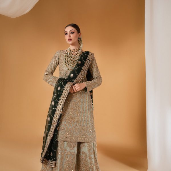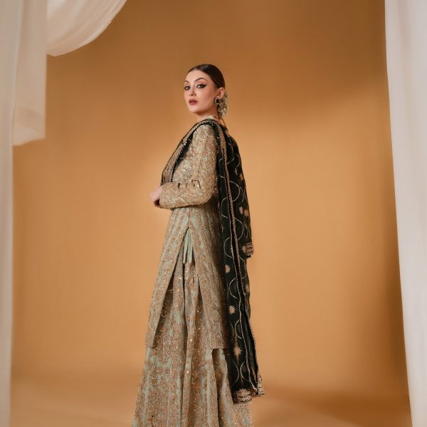 Gender:Â Womenn Category:Â Clothingn Outfit Type:Â Eastern Ready to wearn Sub-Category:Â Lehengan Bottom Style:Â Paneled Lehengan Color Type:Â Greenn Dupatta Fabrics:Â Organzan Number of Pieces:Â 3 Piece –