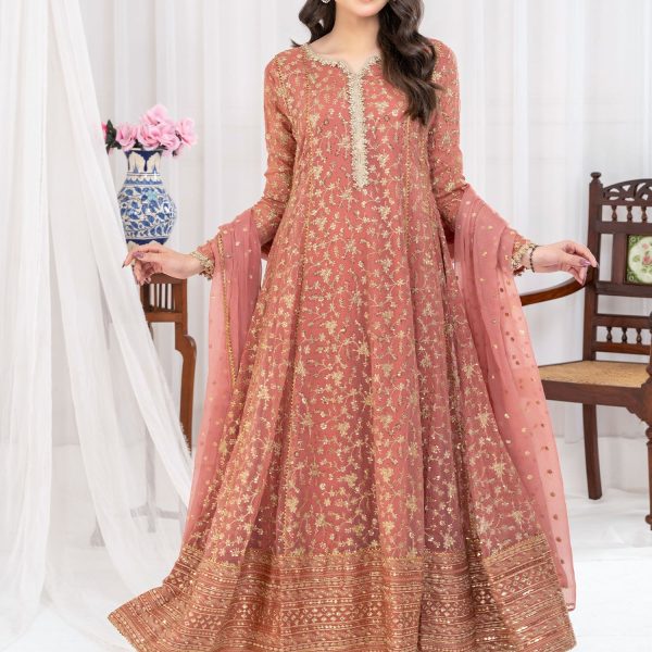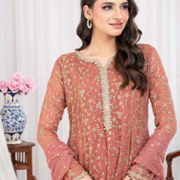 Gender:Â Womenn Category:Â Clothingn Outfit Type:Â Eastern Ready to wearn Sub-Category:Â Pishwasn Color Type:Â Coral Pinkn Dupatta Fabrics:Â Chiffonn Lining Attached:Â As shown in Picturen Number of
