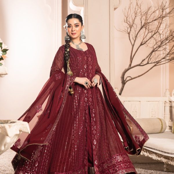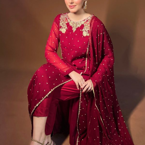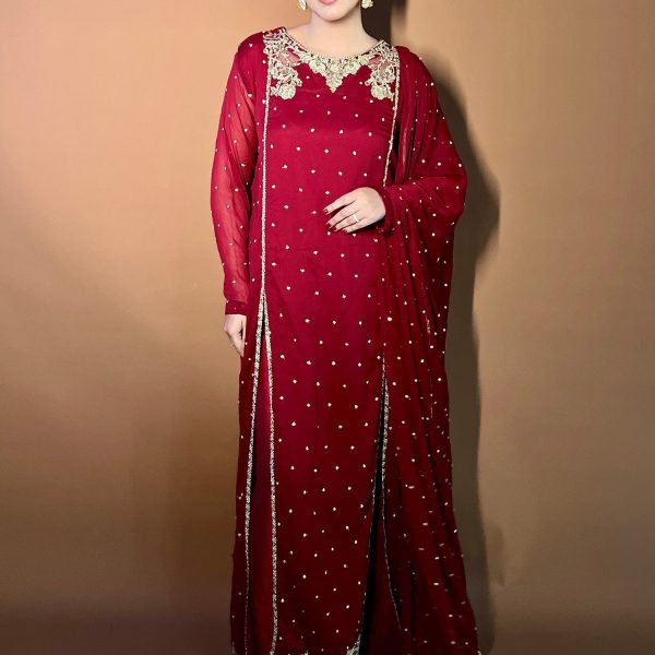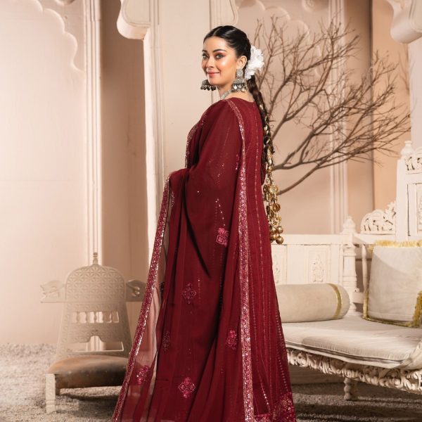 Gender:Â Womenn Category:Â Clothingn Outfit Type:Â Eastern Ready to wearn Sub-Category:Â Pishwasn Bottom Style:Â Straight Trousern Color Type:Â Maroonn Dupatta Fabrics:Â Chiffonn Lining Attached:Â As shown in Picturen