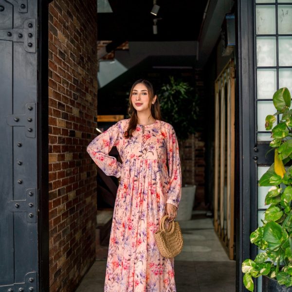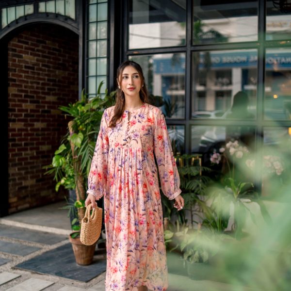 Gender:Â Womenn Category:Â Clothingn Outfit Type:Â Fusionn Sub-Category:Â Maxin Color Type:Â Peach Pinkn Number of Pieces:Â 1 Piece – Topn Season:Â All Seasonn Shirt Fabrics:Â Chiffonn Top Style:Â Flared