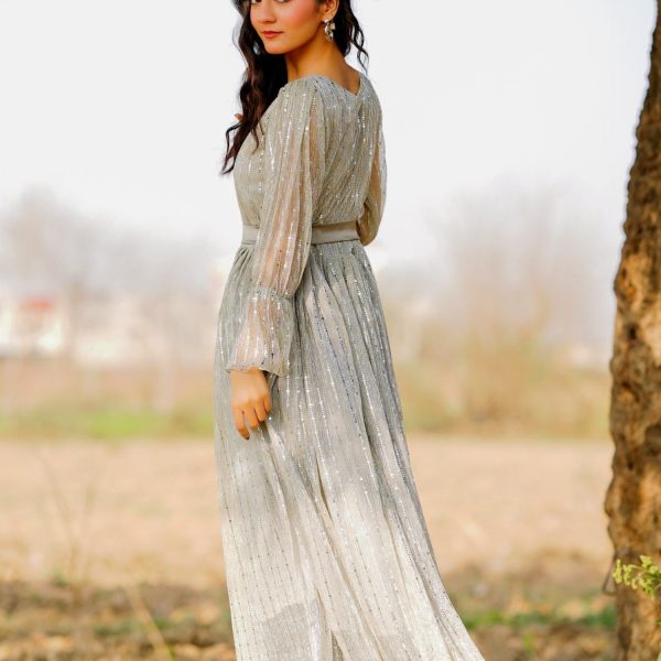 Gender:Â Womenn Category:Â Clothingn Outfit Type:Â Fusionn Sub-Category:Â Maxin Color Type:Â Silvern Number of Pieces:Â 1 Piece – Topn Season:Â All Seasonn Shirt Fabrics:Â Moonlightn Top Style:Â Flared Maxin