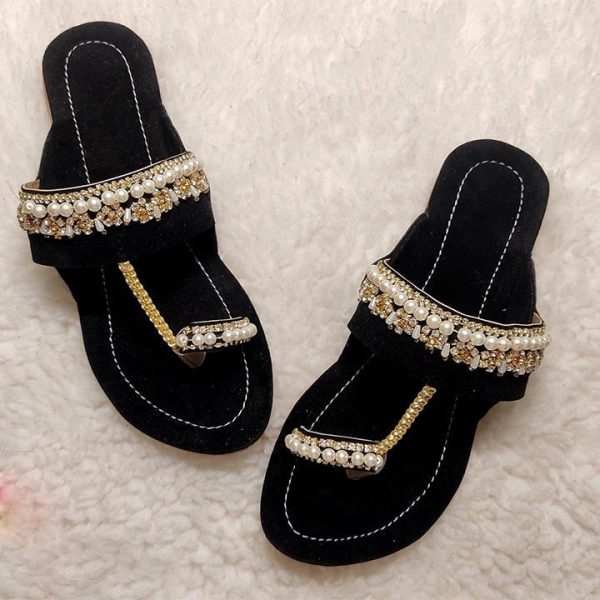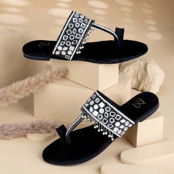 Gender:Â Womenn Category:Â Footwearn Outfit Type:Â Kolapurin Color Type:Â Blackn Sole Material:Â Leathern Top Material:Â Velvetn Additional Description:Â Have those dangling strings of pearls caught your eye