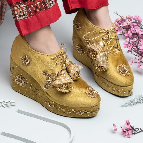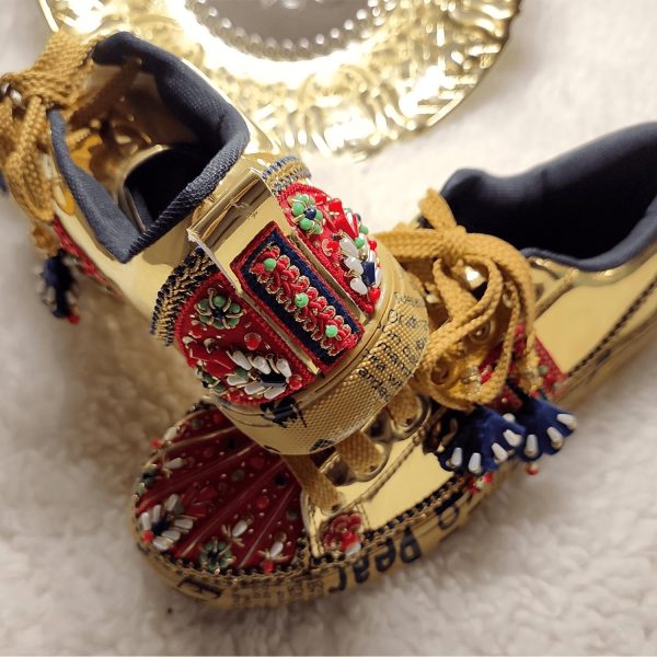 Gender:Â Womenn Category:Â Footwearn Outfit Type:Â Sneakersn Color Type:Â Goldn Sole Material:Â Leathern Top Material:Â Silkn Additional Description:Â ZURUJ’s latest collection of Make to order bridal shoes,