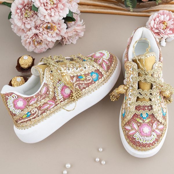 Gender:Â Womenn Category:Â Footwearn Outfit Type:Â Sneakersn Color Type:Â Goldn Sole Material:Â Leathern Top Material:Â Silkn Additional Description:Â THE WEDDING EPISODEnnBecome cool and crazy Bride that does