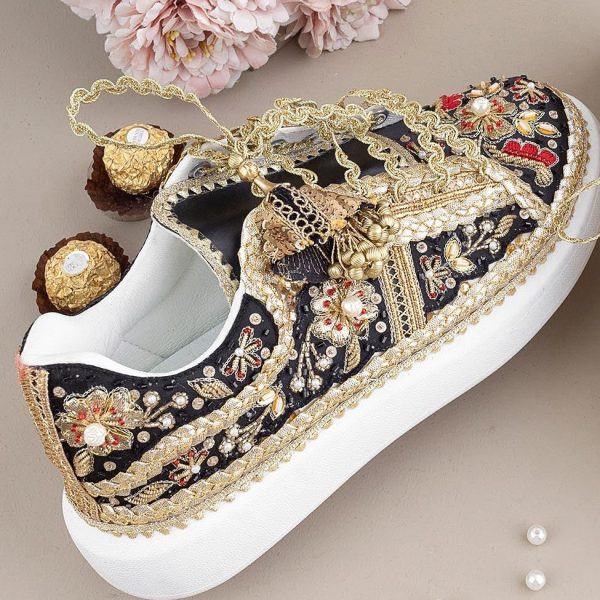 Gender:Â Womenn Category:Â Footwearn Outfit Type:Â Sneakersn Color Type:Â Blackn Sole Material:Â Leathern Top Material:Â Silkn Additional Description:Â ZURUJ’s latest collection of Make to order bridal shoes,