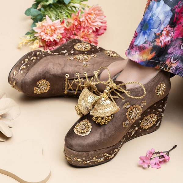 Gender:Â Womenn Category:Â Footwearn Outfit Type:Â Sneakersn Color Type:Â Brownn Sole Material:Â Leathern Top Material:Â Silkn Additional Description:Â THE WEDDING EPISODEnnBecome cool and crazy Bride that does