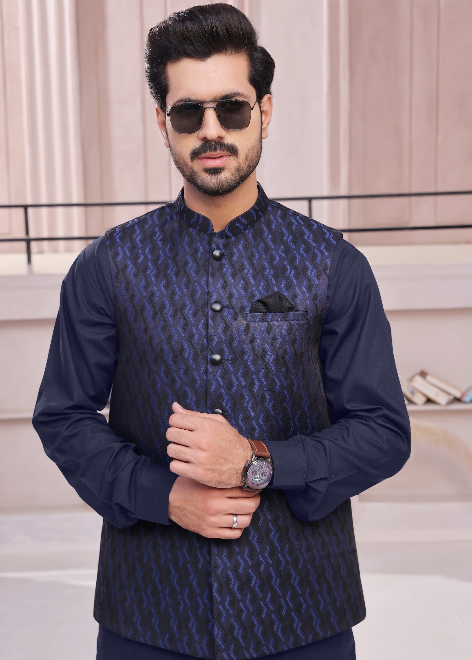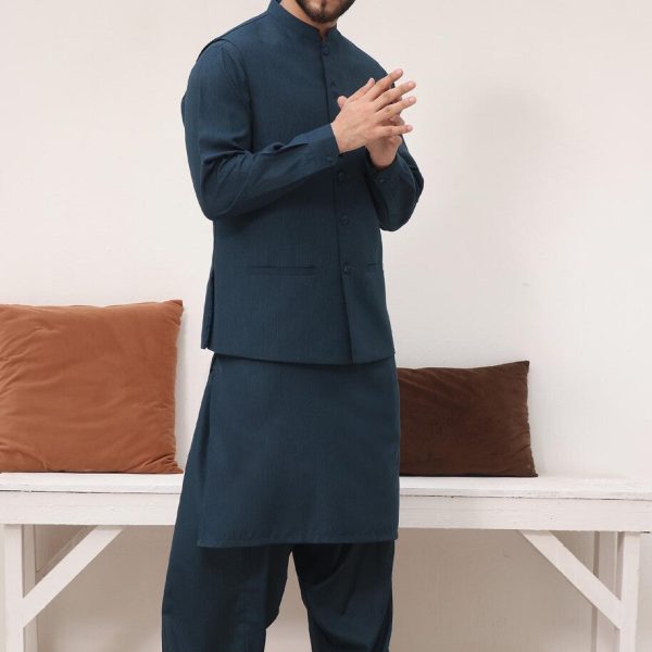 Gender:Â Menn Category:Â Clothingn Outfit Type:Â Easternn Sub-Category:Â Waistcoatn Color Type:Â Tealn Fabric:Â Wash & Wearn Number of Pieces:Â 3 Piece – Top + Bottom + Outerwearn