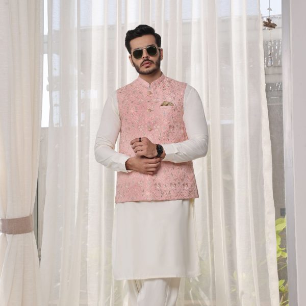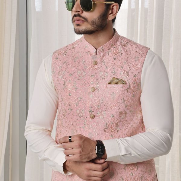 Gender:Â Menn Category:Â Clothingn Outfit Type:Â Easternn Sub-Category:Â Waistcoatn Color Type:Â Baby Pinkn Fabric:Â Raw Silkn Number of Pieces:Â 1 Piece – Outerwearn Product Type:Â Festive/Party Wearn Season:Â All