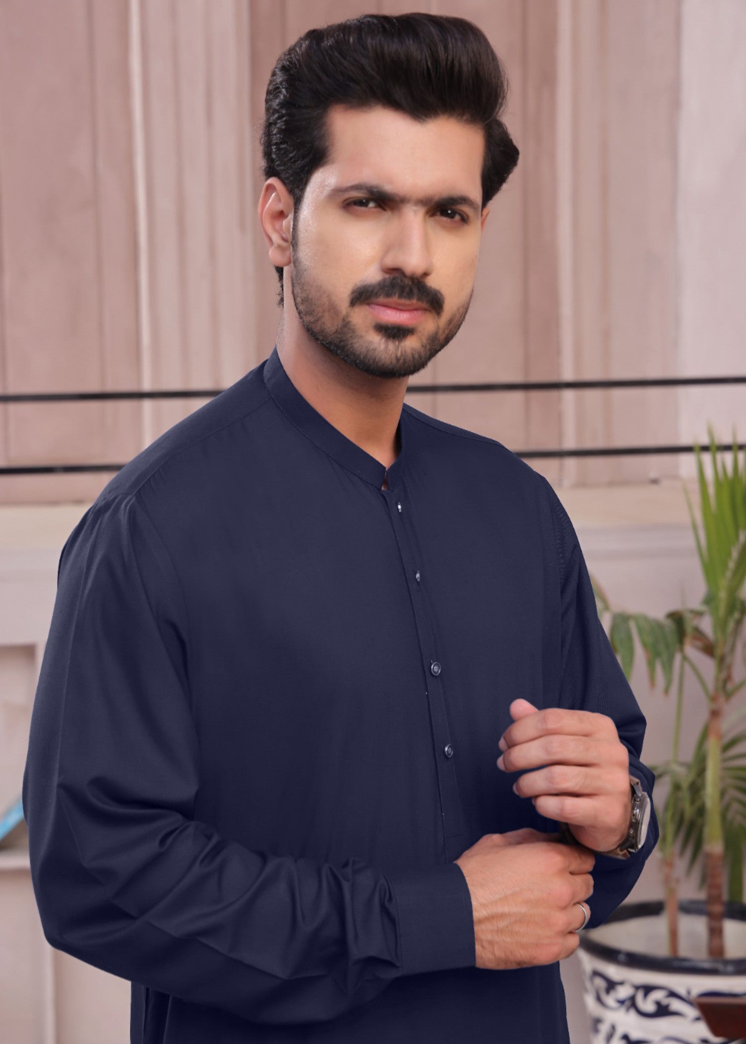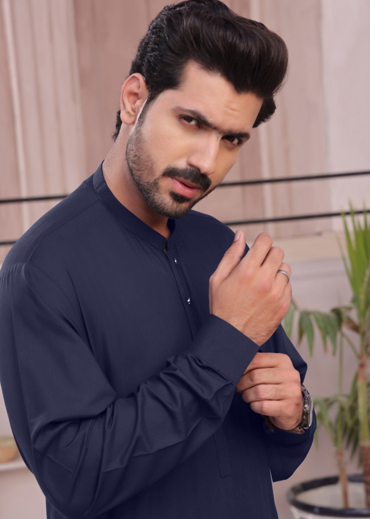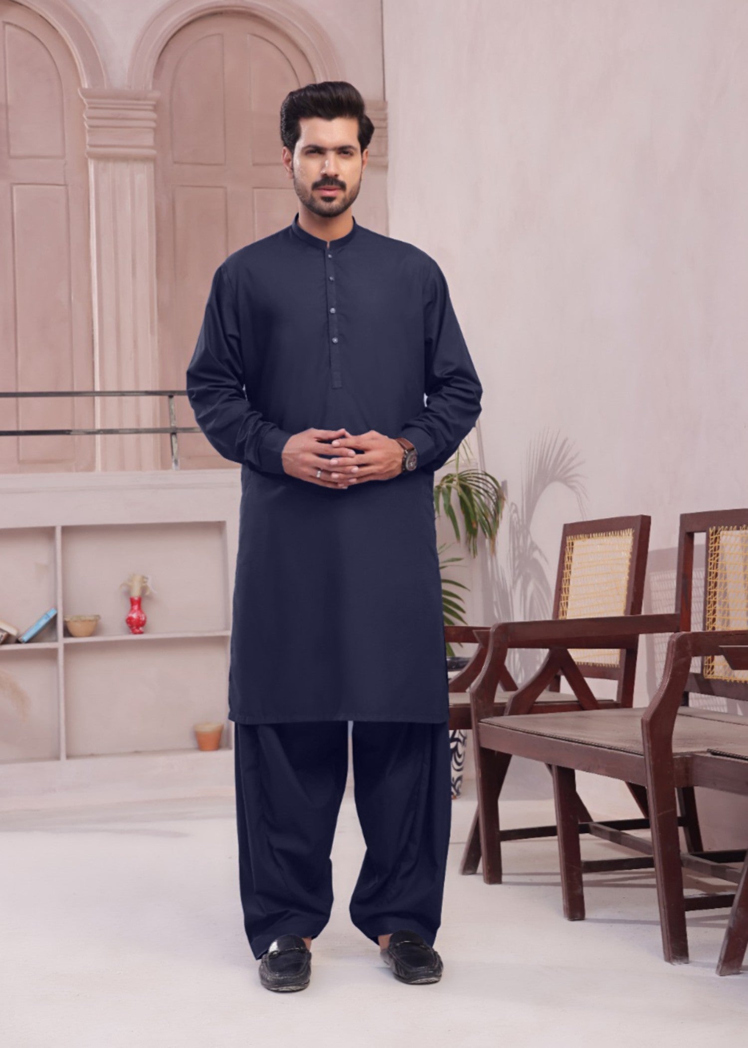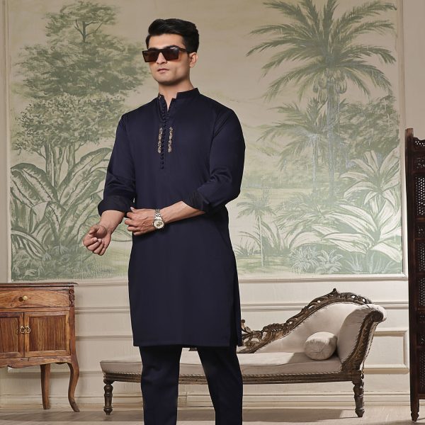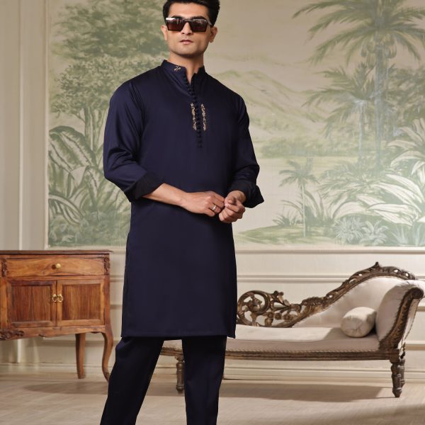 Gender:Â Menn Category:Â Clothingn Outfit Type:Â Easternn Sub-Category:Â Kurta Setn Bottom Style:Â Straight Trousern Color Type:Â Bluen Fabric:Â Cotton Satinn Number of Pieces:Â 2 Piece – Top &