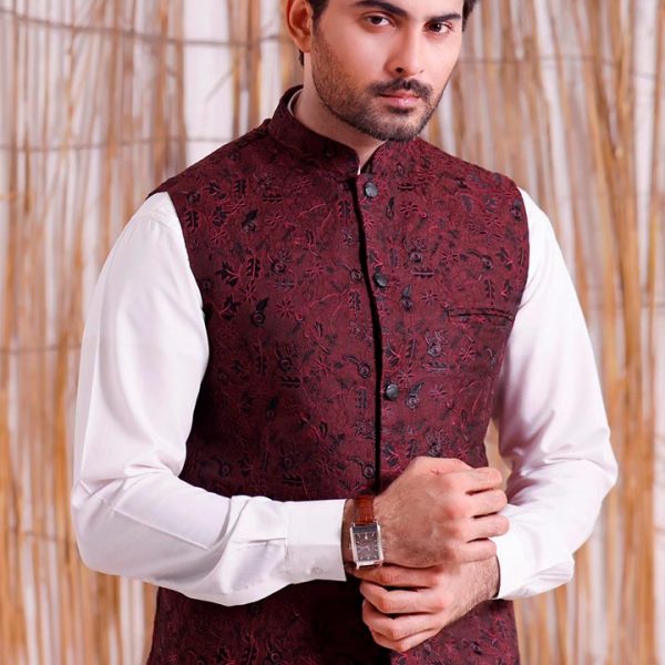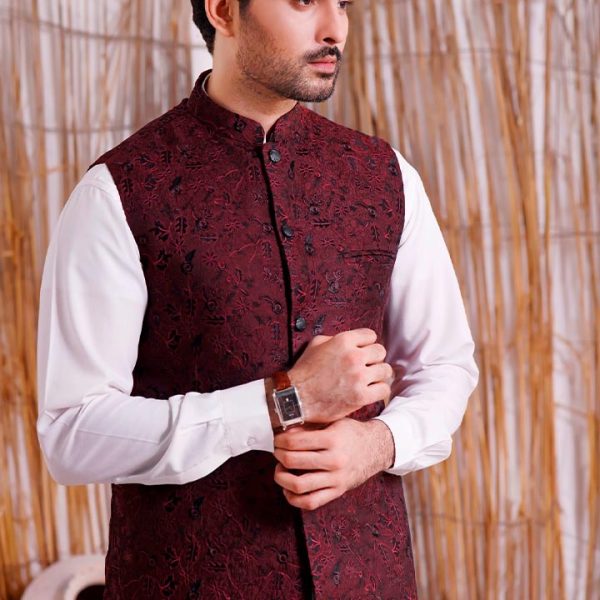 Gender:Â Menn Category:Â Clothingn Outfit Type:Â Easternn Sub-Category:Â Waistcoatn Color Type:Â Maroonn Fabric:Â Jamawarn Number of Pieces:Â 1 Piece – Outerwearn Product Type:Â Festive/Party Wearn Season:Â All Seasonn Additional