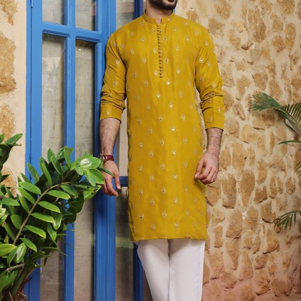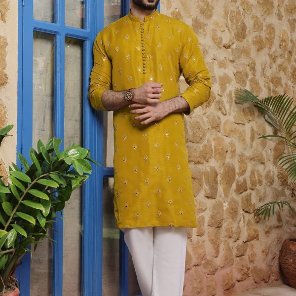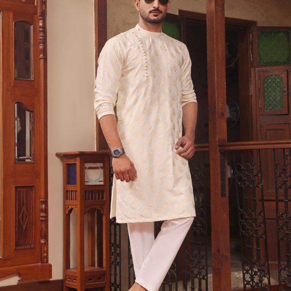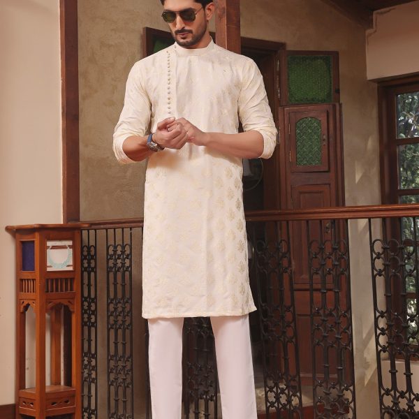 Gender:Â Menn Category:Â Clothingn Outfit Type:Â Easternn Sub-Category:Â Kurta Setn Bottom Style:Â Straight Trousern Color Type:Â Ivoryn Fabric:Â Cotton Silkn Number of Pieces:Â 2 Piece – Top &