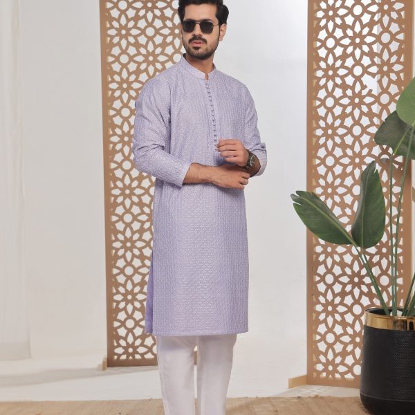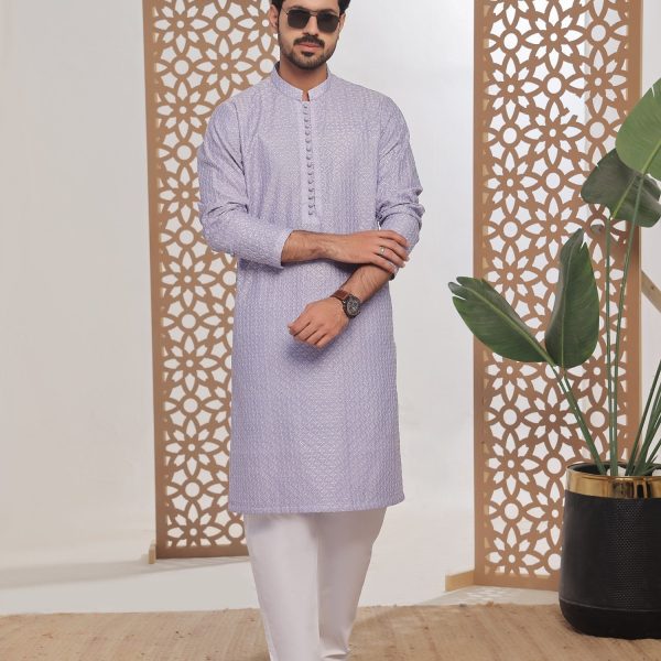 Gender:Â Menn Category:Â Clothingn Outfit Type:Â Easternn Sub-Category:Â Kurta Setn Bottom Style:Â Straight Trousern Color Type:Â Lavender Mistn Fabric:Â Lawnn Number of Pieces:Â 2 Piece – Top &
