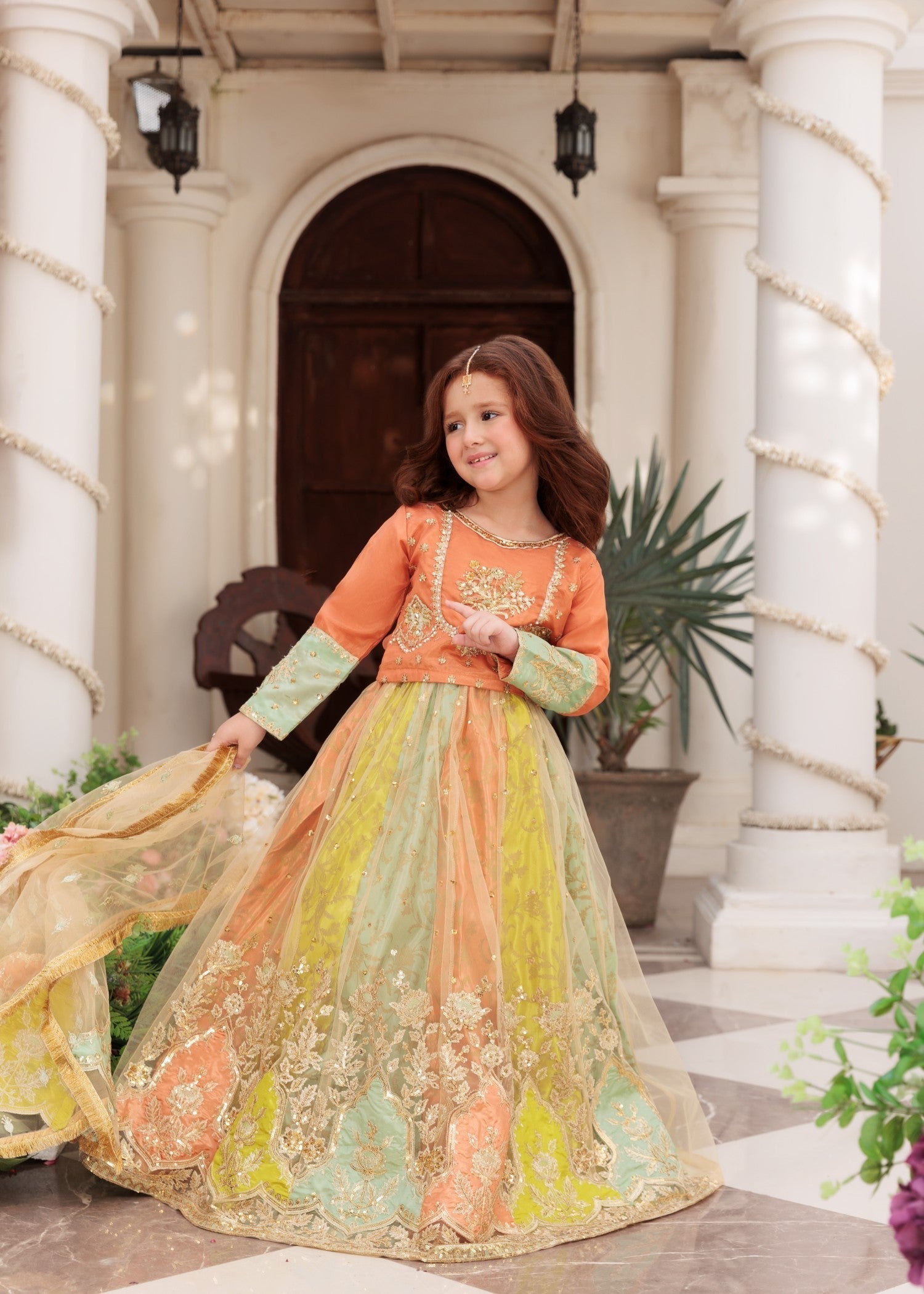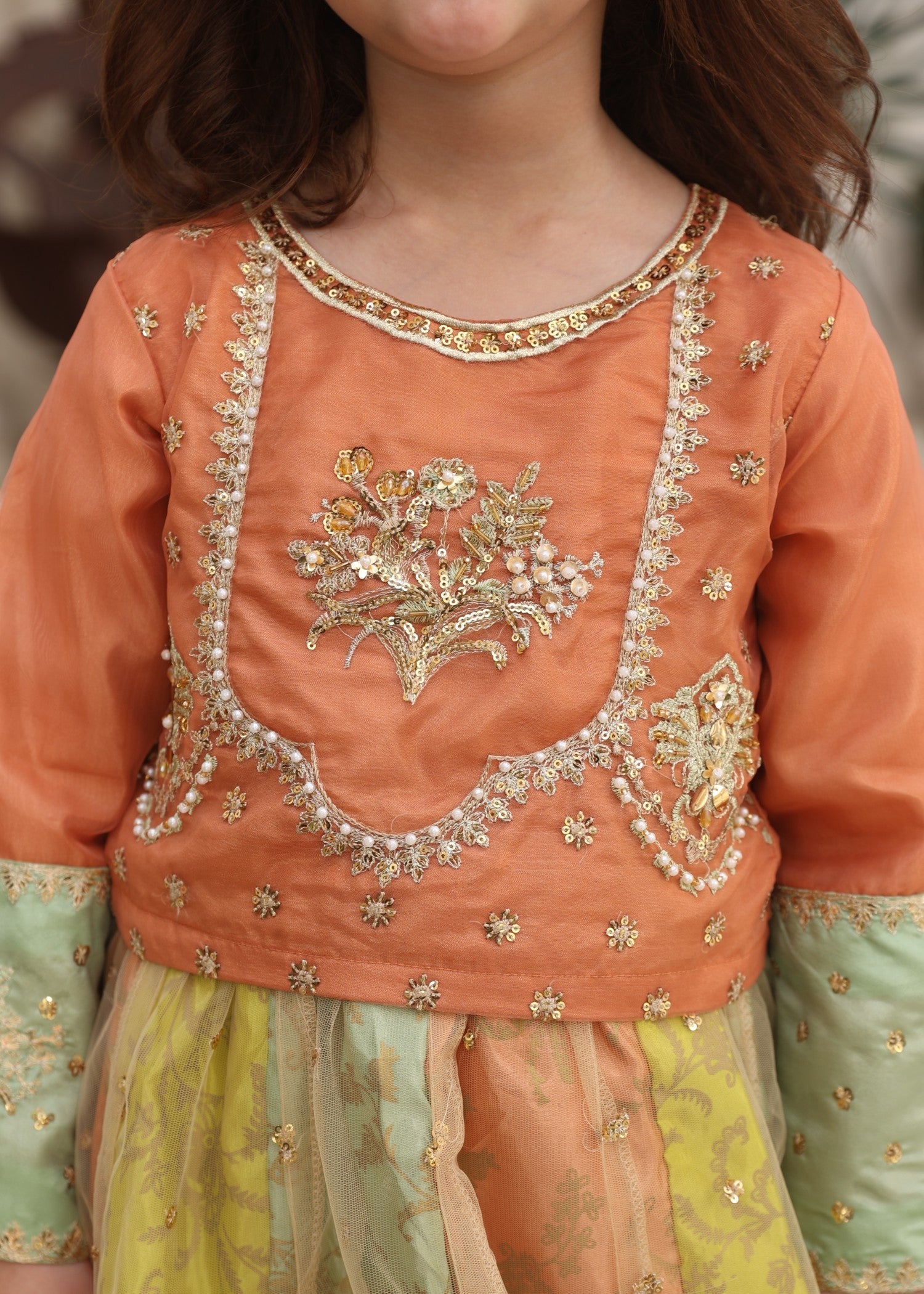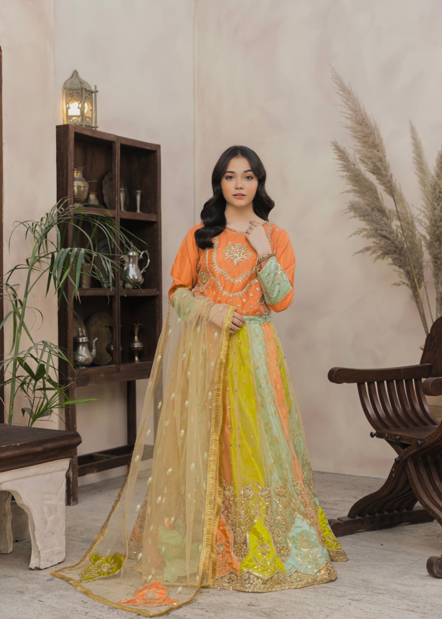 Additional Description: Description: n-Sequins, tilla and thread embroidered net kurti with tefta silk inner lining further enhanced with hand work.n-Sequins, tilla and thread embroidered lehenga with printed tefta silk inner lining and cancan border.n-Embroidered net dupatta, four sides embroidered patches and lace.nnnThis article includes Kurti, Dupatta and Lehnga.nn
