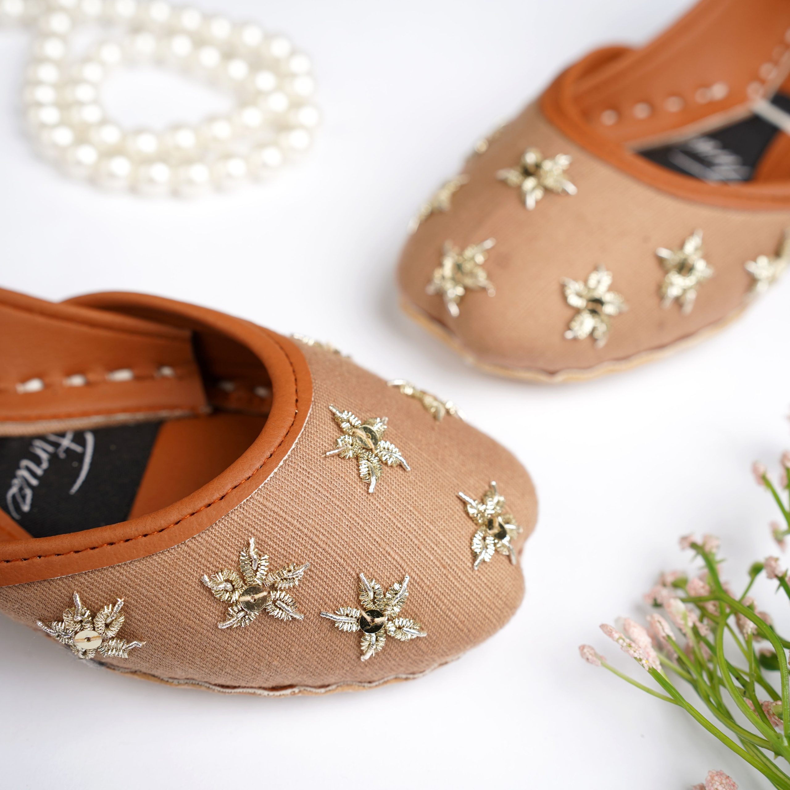 Additional Description: Sole: Upper is of Banyan over a base of Leather.nnHandwork: YesnnNote: Each handcrafted piece is unique; as with all handmade products there can be slight variations in color and finish. Choose a snug fit for yourself as leather expands slightly with multiple uses and conforms to your feet. Please consult our size chart before ordering. Rest assured, our shoes are true to size.nnDisclaimer: Product colour may vary due to lighting, monitor and display settings.nnCleaning: Gently wipe with slightly damp cloth. Best to avoid getting them wet. Colours used are water-resistant and won’t come off unless rigorously used. Put away your khussas when dry only.n