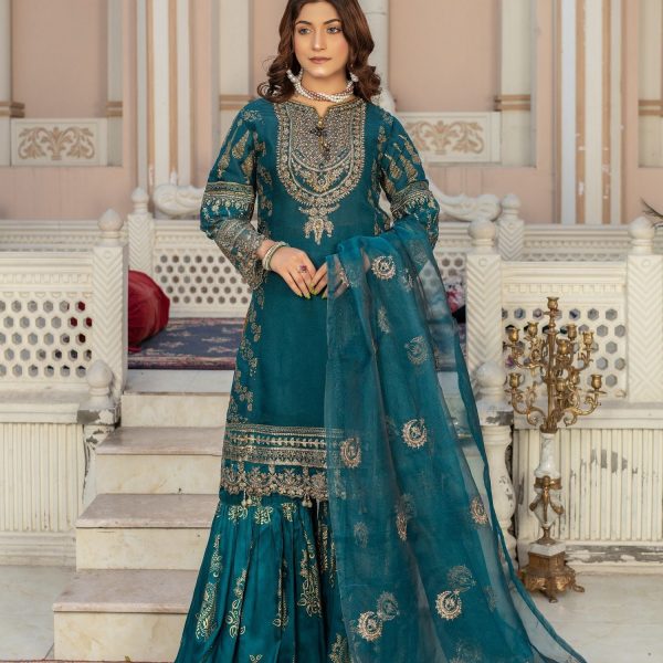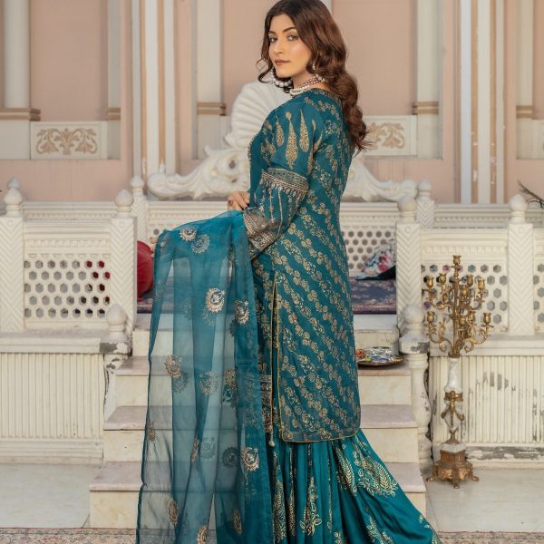 Gender:Â Womenn Category:Â Clothingn Outfit Type:Â Eastern Ready to wearn Sub-Category:Â Ghararan Bottom Style:Â Flared Ghararan Color Type:Â Tealn Number of Pieces:Â 3 Piece – Top +