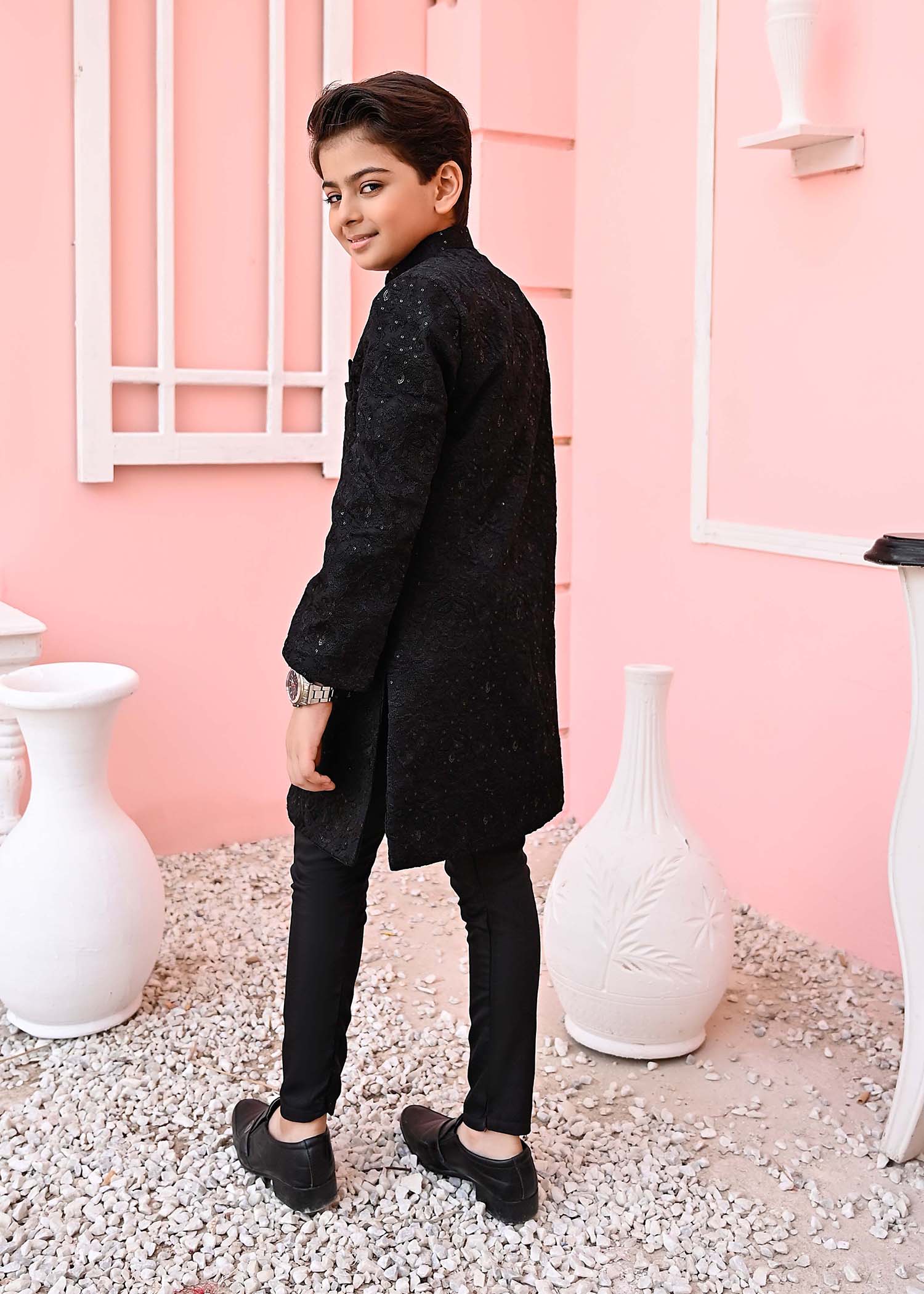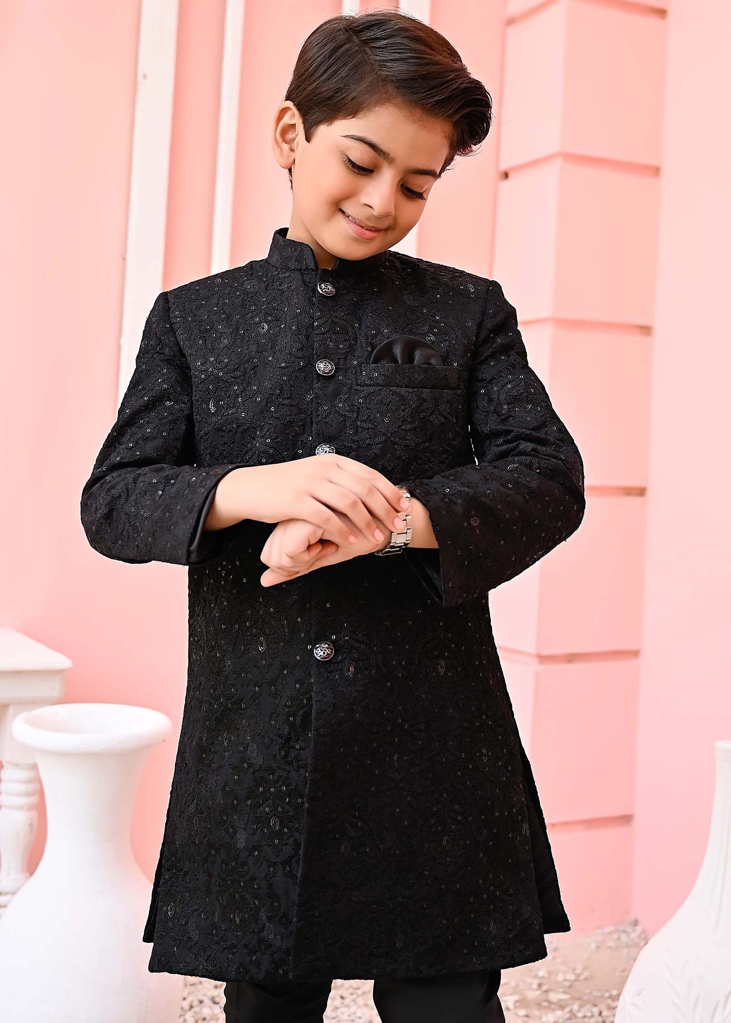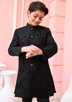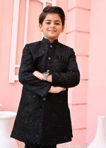 Additional Description:Â This sherwani is made of luxurious black fabric and adorned with intricate sequin embroidery. The sequins add a touch of sparkle and glamour to the outfit. The design is carefully crafted, showcasing traditional motifsand patterns.nnIncludes Black Sherwani nFor boys 1 – 11 years.nThe Size Chart of The Article Is Given Below.n
