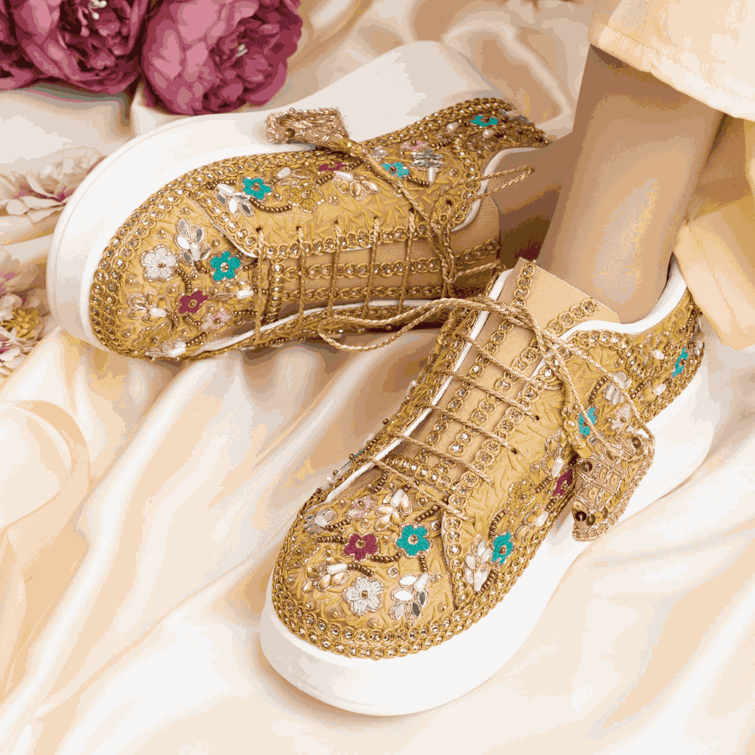 Additional Description: THE WEDDING EPISODEnnBecome cool and crazy Bride that does not compromise on comfort yet Trendy and exclusive designs on her Big Dayâ£ï¸â¤ï¸ nnFrom a pictorial photographically bridal sneaker to actually manufacturing it with the finest artisans it took us many hours and days to strike the combo of hit design – pattern – colour and to render traditional design on a modern sneaker.nnWe are just overwhelmed to see how well it all came together â¤ï¸ nnStyle up in grace your big day with these pairs of bridal sneakers by Zurujnn nnZURUJ’s latest collection of Make to order bridal shoes, these bridal shoes are made with love and care on golden base to ensure that the Bride feels like a princess.nn These are make to order which takes from 30 to 40 working days.n