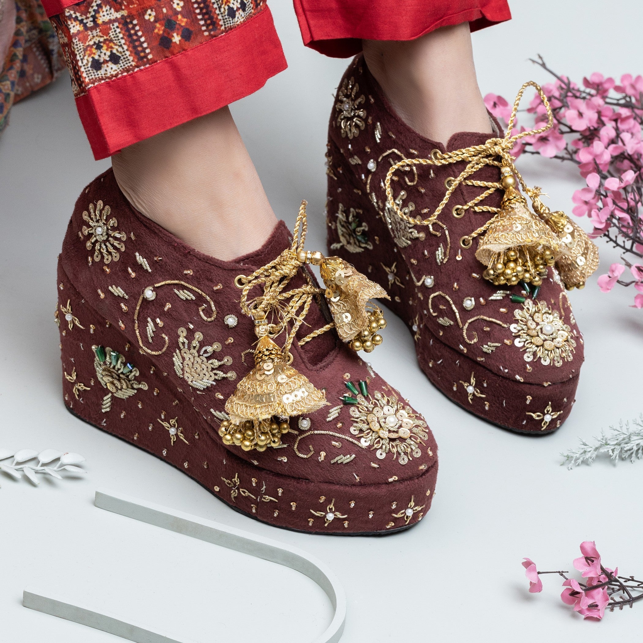 Additional Description: THE WEDDING EPISODEnnBecome cool and crazy Bride that does not compromise on comfort yet Trendy and exclusive designs on her Big Dayâ£ï¸â¤ï¸ nnFrom a pictorial photographically bridal sneaker to actually manufacturing it with the finest artisans it took us many hours and days to strike the combo of hit design – pattern – colour and to render traditional design on a modern sneaker.nnWe are just overwhelmed to see how well it all came together â¤ï¸ nnStyle up in grace your big day with these pairs of bridal sneakers by Zurujnn nnZURUJ’s latest collection of Make to order bridal shoes, these bridal shoes are made with love and care on red base to ensure that the Bride feels like a princess.nn These are make to order which takes from 30 to 40 working days.nn n