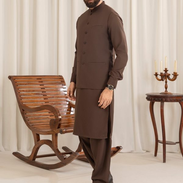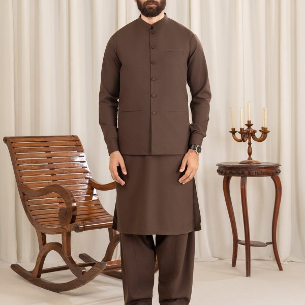 Gender:Â Menn Category:Â Clothingn Outfit Type:Â Easternn Sub-Category:Â Waistcoatn Color Type:Â Chocolate brownn Fabric:Â Wash & Wearn Number of Pieces:Â 3 Piece – Top + Bottom +