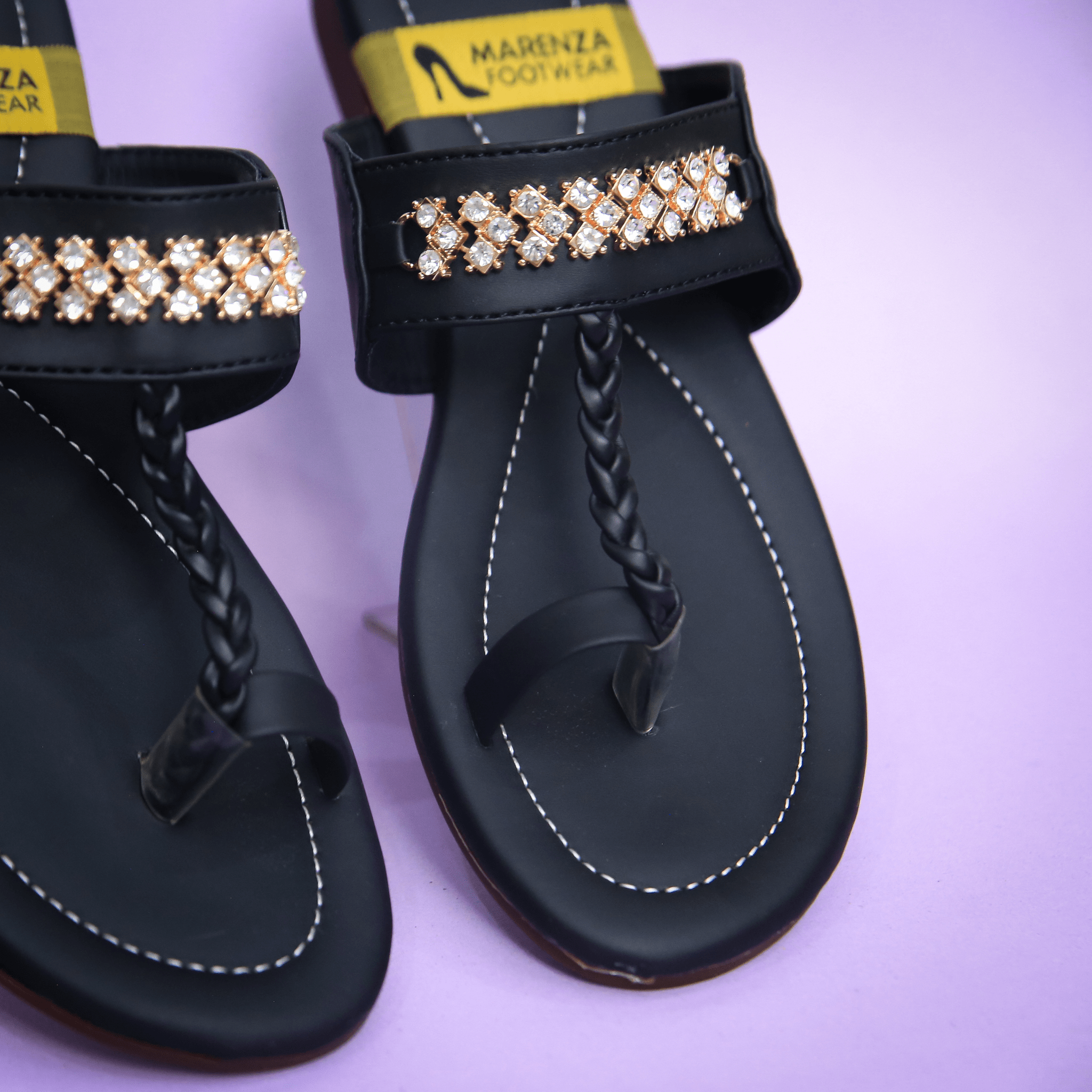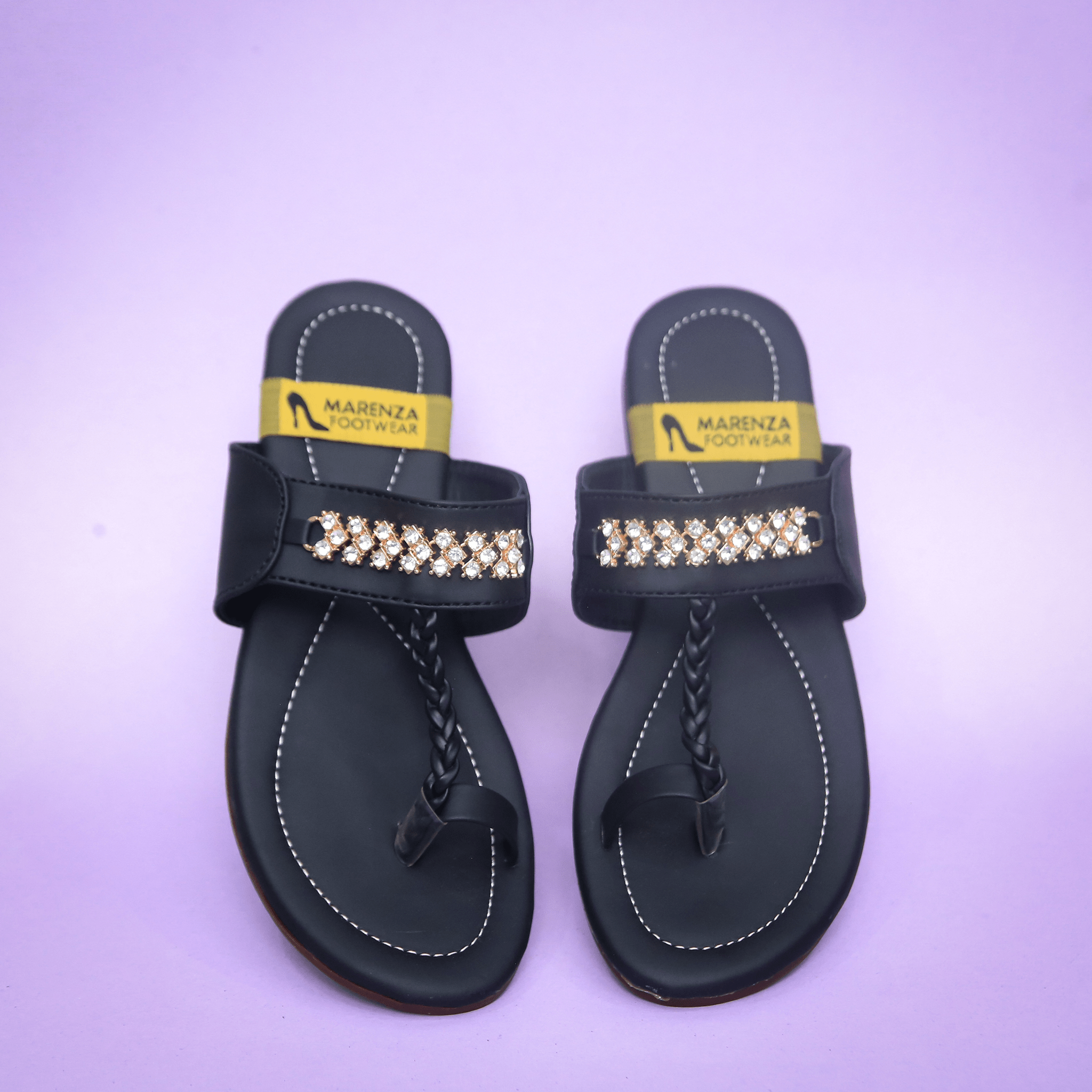 Additional Description: The Crystal Kolhapuri blends timeless style with modern durability. This elegant black Kolhapuri features sparkling crystal embellishments on the upper strap and a strong, flexible rubber sole that provides a sturdy grip and long-lasting wear. Expertly crafted with high-quality materials, it’s solidly built for long life and repeated use without losing its charm. Ideal for festive occasions or daily glam looks, this piece combines beauty with lasting strength. Please carefully read the size chart before order.n