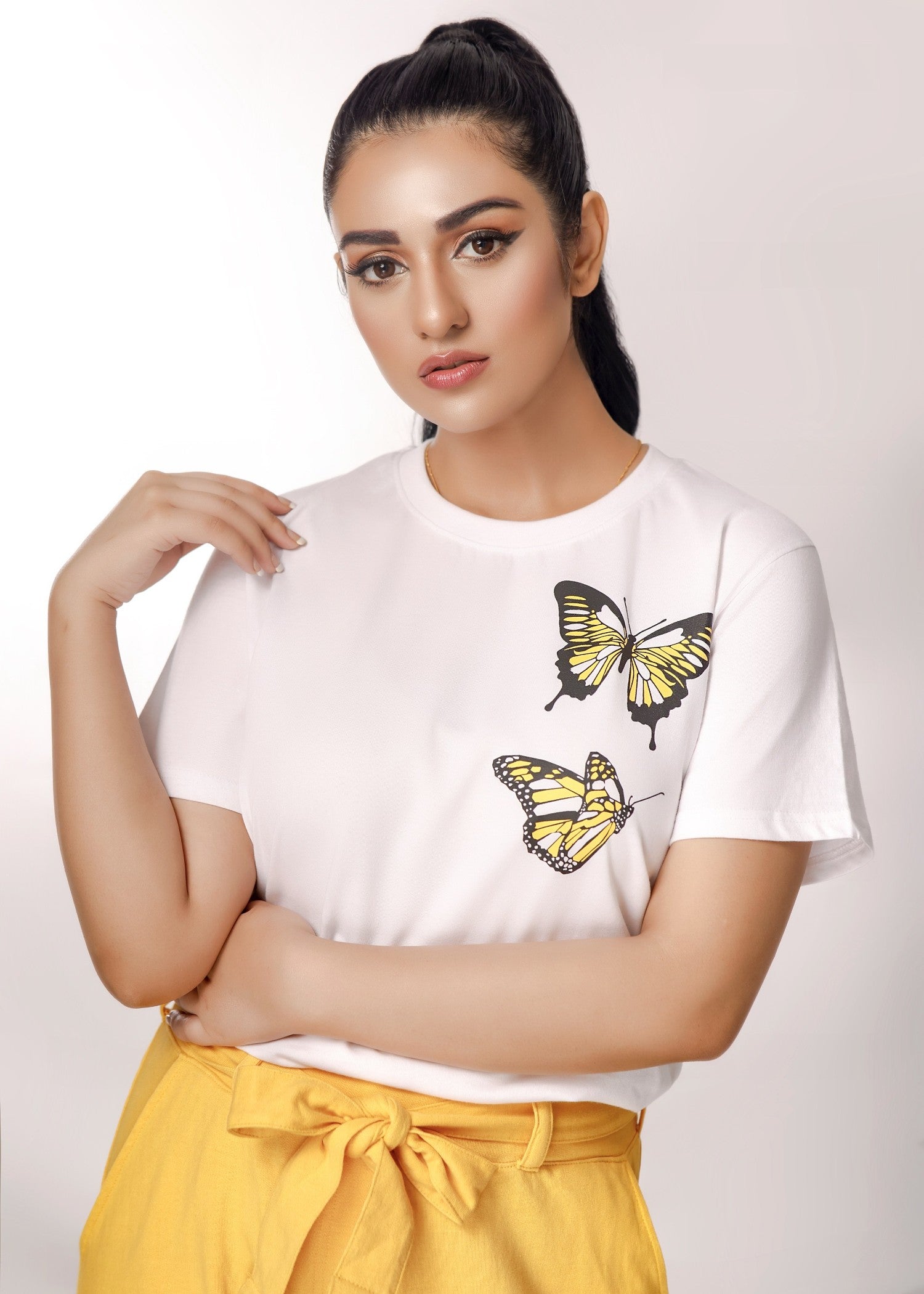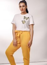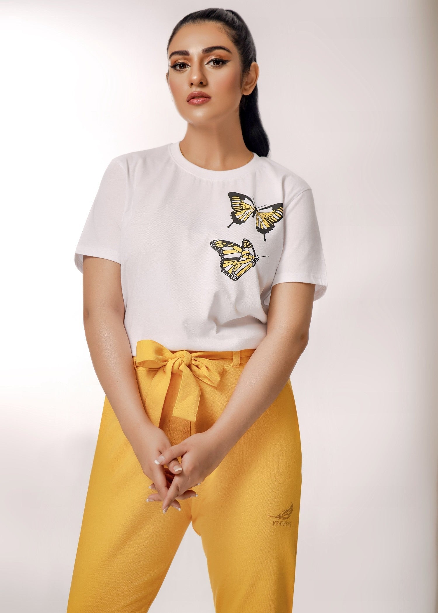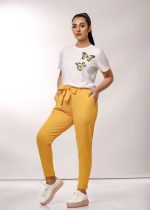 Additional Description:Â Keeping up with the winter trend, Feathers has come up yet again to knock your hearts & doors. Mesmerizing prints & cuts with matchless comfort crafted on light stretchable summer fabric especially designed to soothe the seasonal warmth is what the collection is all about.nnOutfit: The article composes of white tees with printed yellowish butterflies. The yellow trouser pants is exclusively designed with complimented broad belt.nnFabric: Shirt is composed of 100% cotton while the trouser pant is cotton terry. The fabric is especially crafted sweat free for Asian summers.nnFeel the comfort you crave!nnPremium export quality.n