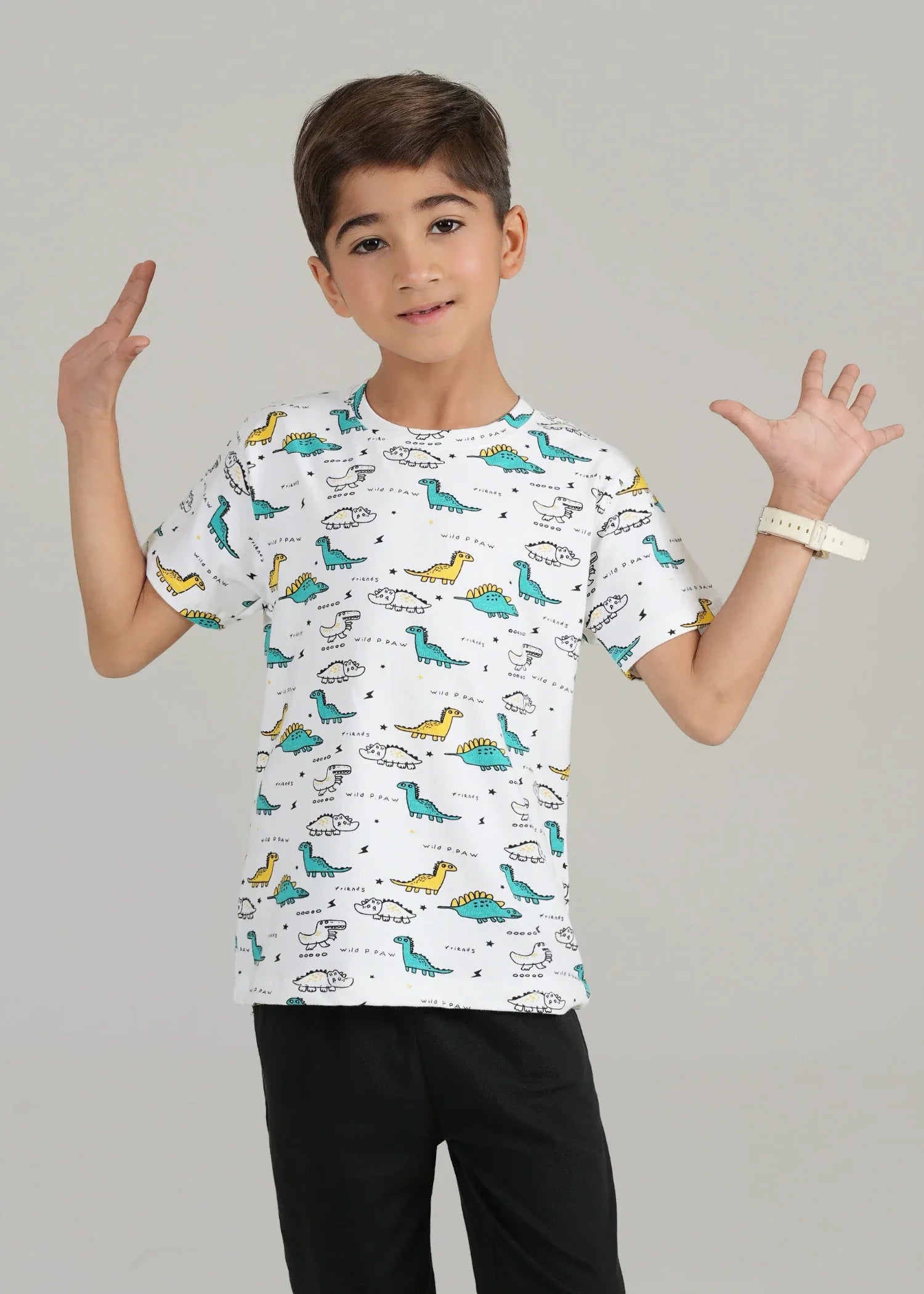 Additional Description:Â Refresh their basics collection with this pure cotton t-shirts and Trouser. Comfy Short Body fit, with Contrast breezy short sleeves and a neat round neck. Includes an all over Print T shirt & Trouser Front Screen Print nnKeeping Your child coolnRound NecknScreen Print on on Trouser and All over Print on ShirtnIdeal for summernFabric : 100% Cotton (Jersey)n