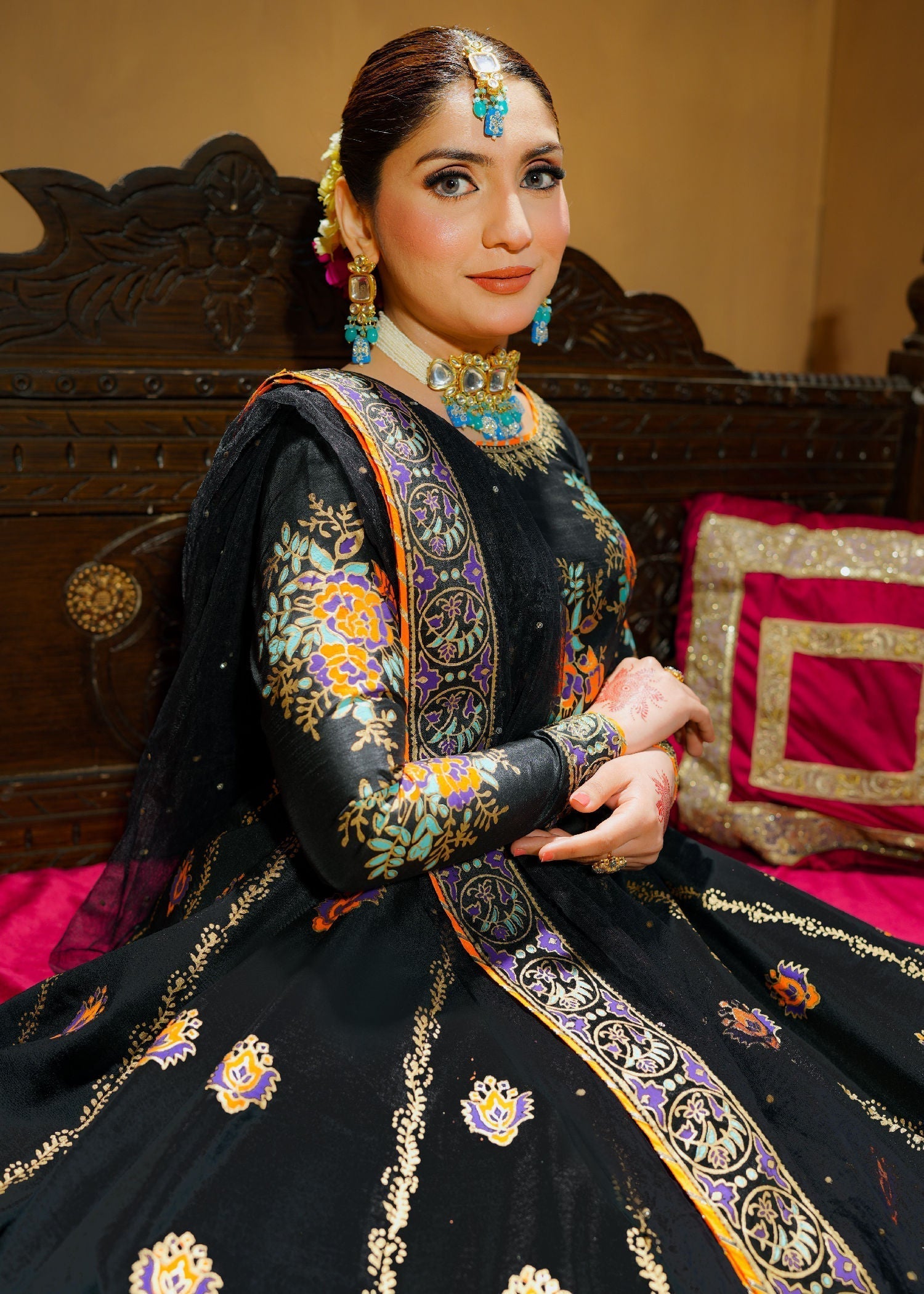 Additional Description: Ready-to-WearnFabric: Premium Raw SilknDupatta: Soft Net, Raw Silk for bordernColor: BlacknFlare: 240 inchesnCancan attached for nice volume.nComes with a cute pouch nnModel Height: 5’3â€nModel Size: XSnColors can slightly vary from pictures depending upon your device settings.nnPrecautions:nDo not apply iron directly on the print.nDry Clean only.nn‘DIYA’ Step into elegance with this stunning black dress ‘DIYA’! Made from luxurious raw silk, it features exquisite machine tilla embroidery on the neckline and sleeves, created using the hand block technique. The hand block print on the lehenga flare adds a touch of traditional charm. Cancan attached for nice volume. The gotta lace on the choli and lehenga flare beautifully complements the overall design. With a back zip adorned with tassels, it’s both stylish and convenient. The cancan attached gives the lehenga flare a graceful volume. The net dupatta with stone details and printed border with gotta lace completes the ensemble perfectly. Plus, it comes with a separate pouch, making it ideal for weddings and festive occasions. This dress will make you the center of attention. Shine bright and make a statement with this gorgeous black dress!” #Diya #GulPosh #EasternFusion #EmbrioderyDetails #HandBlockPrintingn