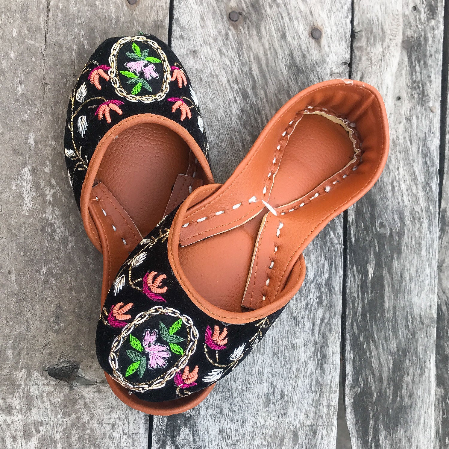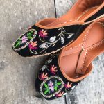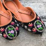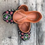 Additional Description:Â Elegant black velvet khussa with delicate embroidery in peachy, pink and shades pf green. It has neatly finished kora and naqshi work with promised comfort for your little ones feetn