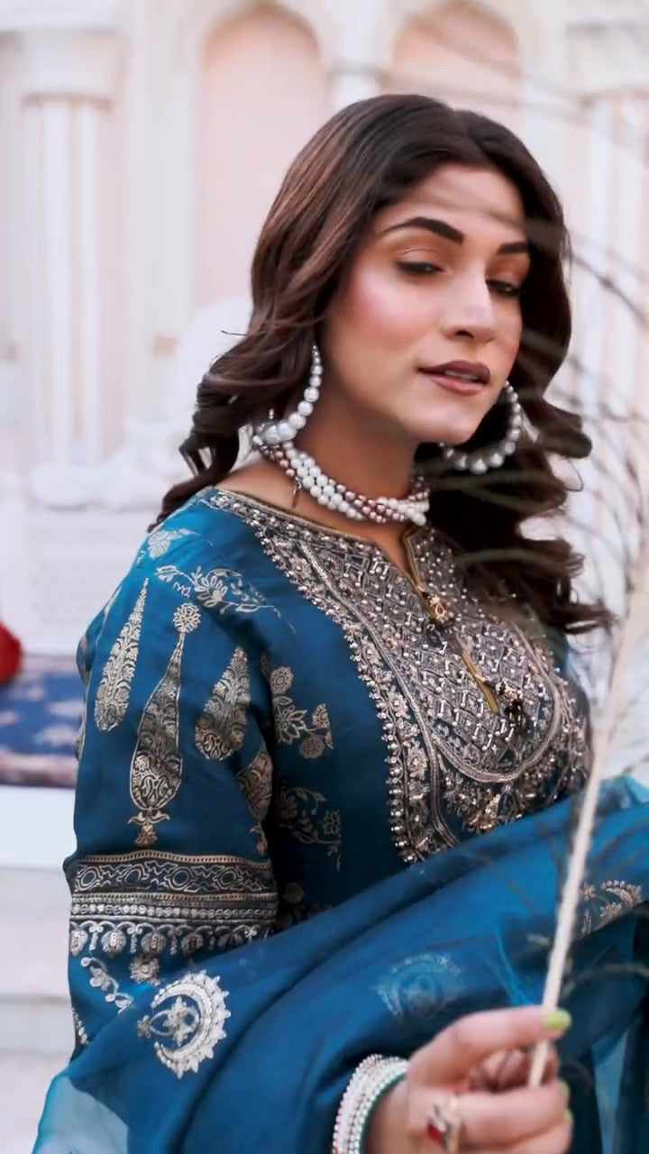 Additional Description:Â Embrace the ethereal charm of this ensemble. This chiffon shirt features intricate neck work and block printing on the side panels, exuding grace and sophistication. Paired with a totally block printed grip gharara and an embroidered organza dupatta, “Ethereal Charm” brings a touch of timeless elegance to your wardrobe. Category – Ready to Wear The model in the picture is wearing a size SMALL. “Please note that the actual color may vary slightly