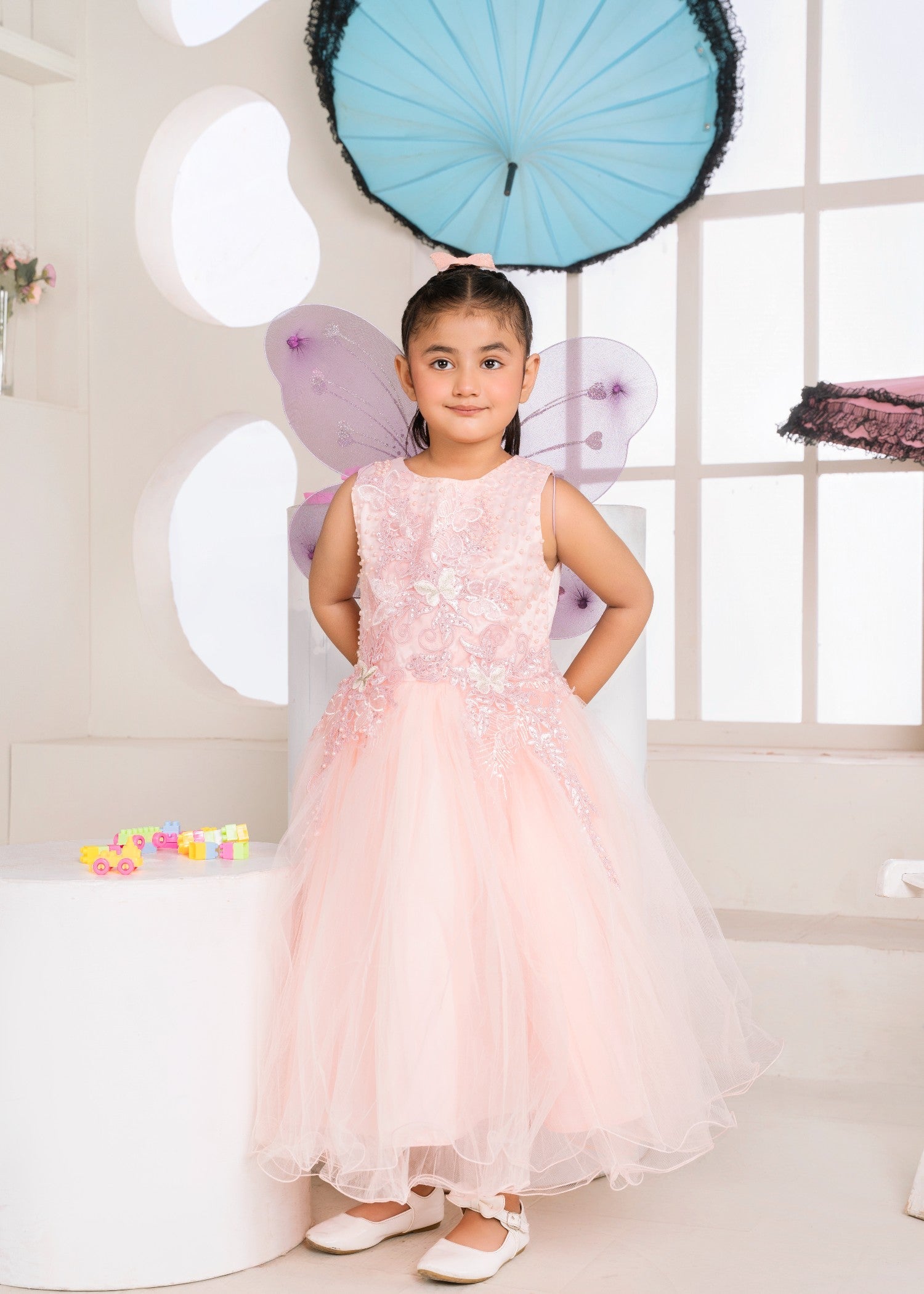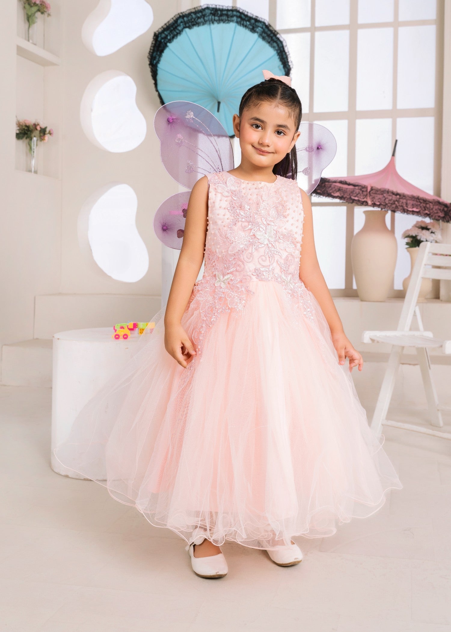 Gender:Â Girln Category:Â Clothingn Outfit Type:Â Easternn Sub-Category:Â Ghararan Bottom Style:Â Ghararan Color Type:Â Coral Pinkn Dupatta Fabrics:Â Netn Number of Pieces:Â 3 Piece – Top + Bottom