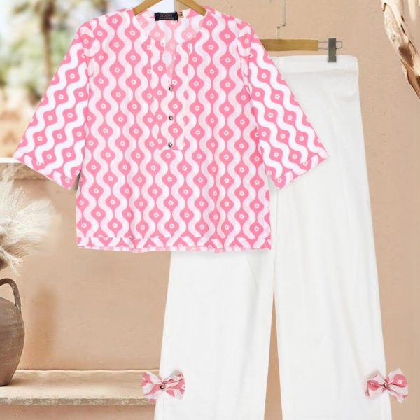 Gender:Â Girln Category:Â Clothingn Outfit Type:Â Westernn Sub-Category:Â Co Ord Setsn Bottom Fabric:Â Cottonn Bottom Style:Â Straight Trousern Color Type:Â Pinkn Number of Pieces:Â 2 Piece – Top