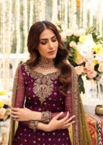 Gender:Â Womenn Category:Â Clothingn Outfit Type:Â Eastern Ready to wearn Sub-Category:Â Ghararan Bottom Style:Â Flared Ghararan Color Type:Â Magenta Hazen Dupatta Fabrics:Â Organzan Number of Pieces:Â 3 Piece