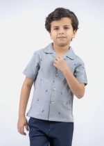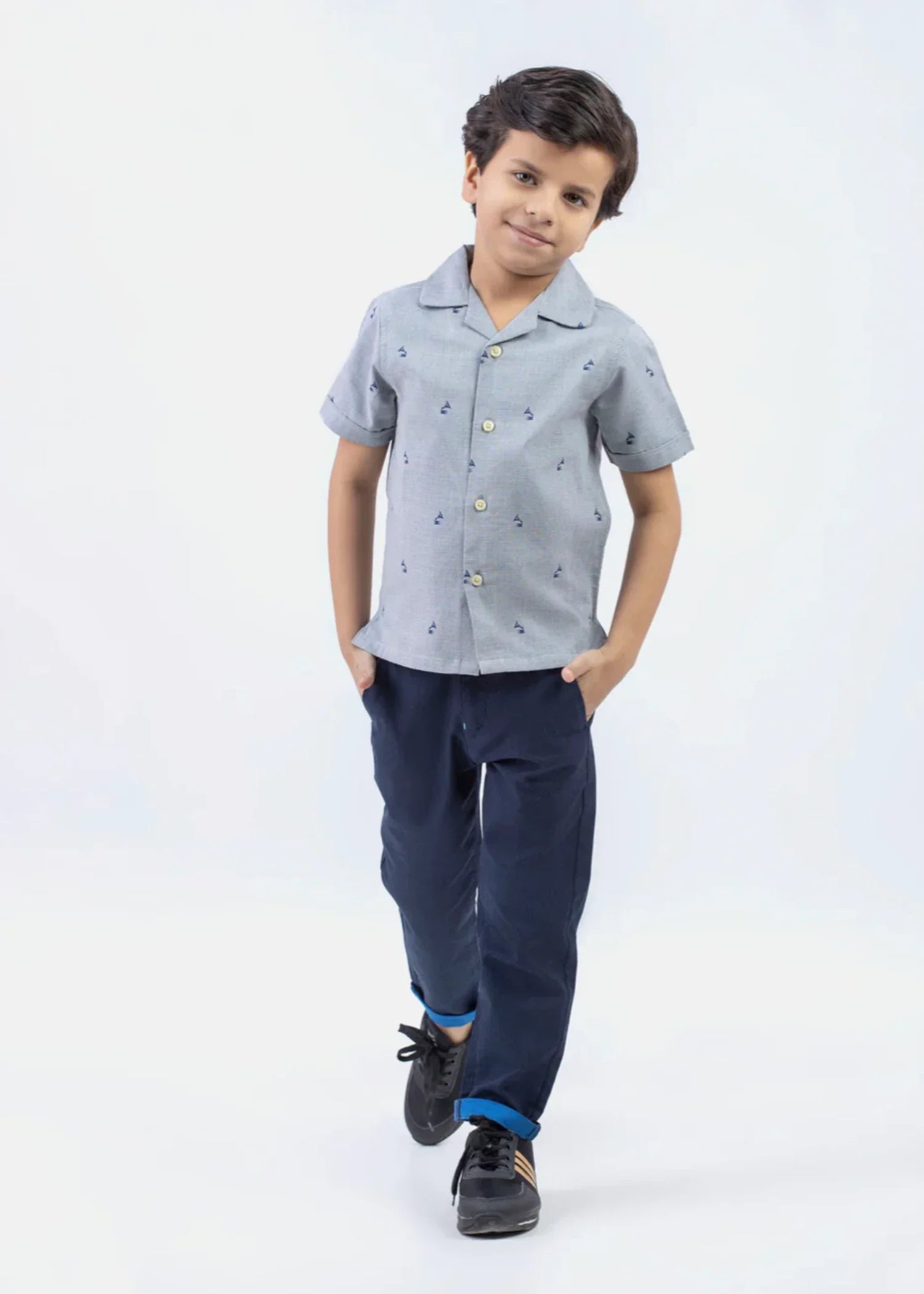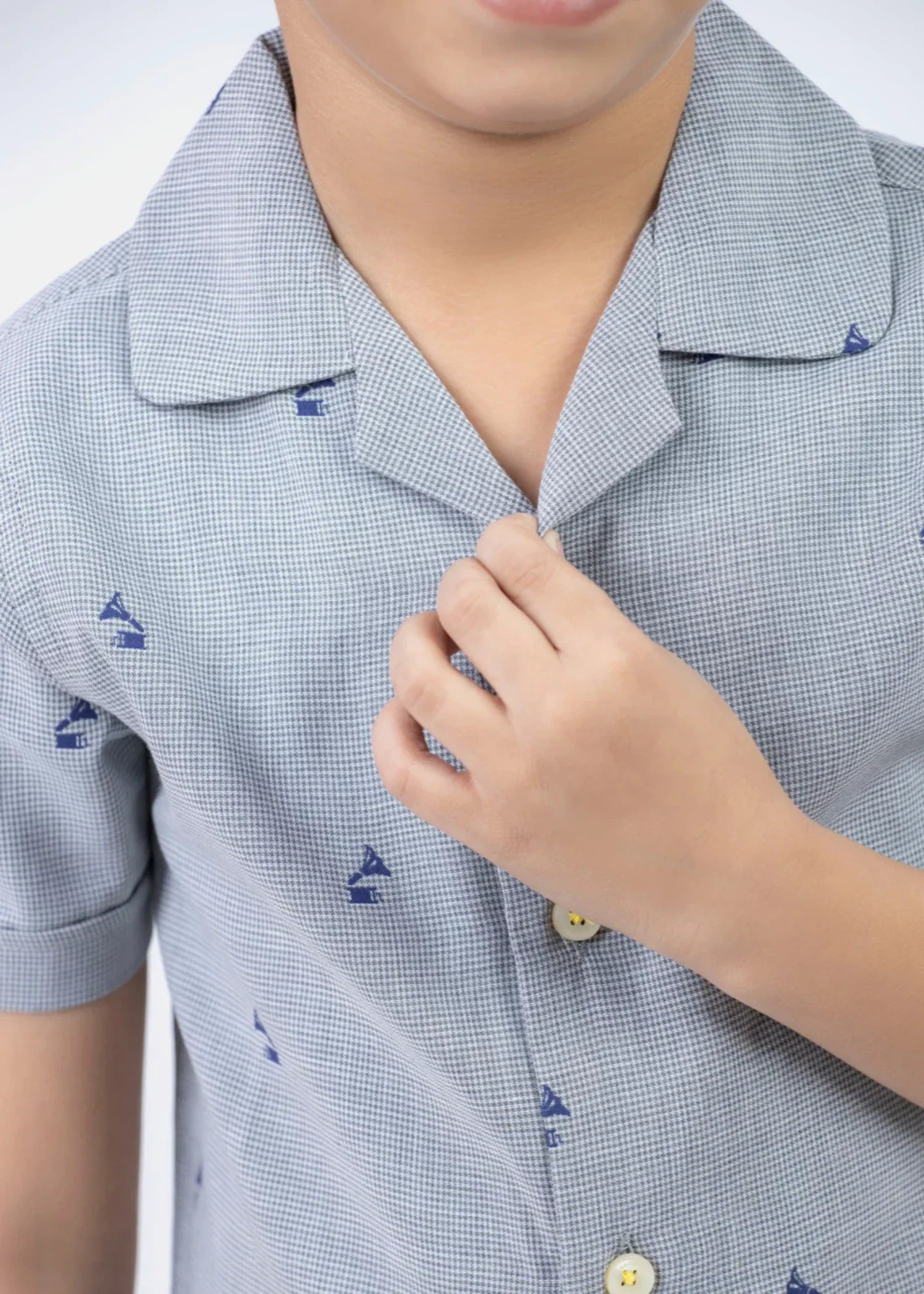 Additional Description: Stay cool and stylish with our kids’ grey textured printed Cuban collar shirt, featuring half sleeves and a textured fabric that’s perfect for warm weather play and casual wear.nnn