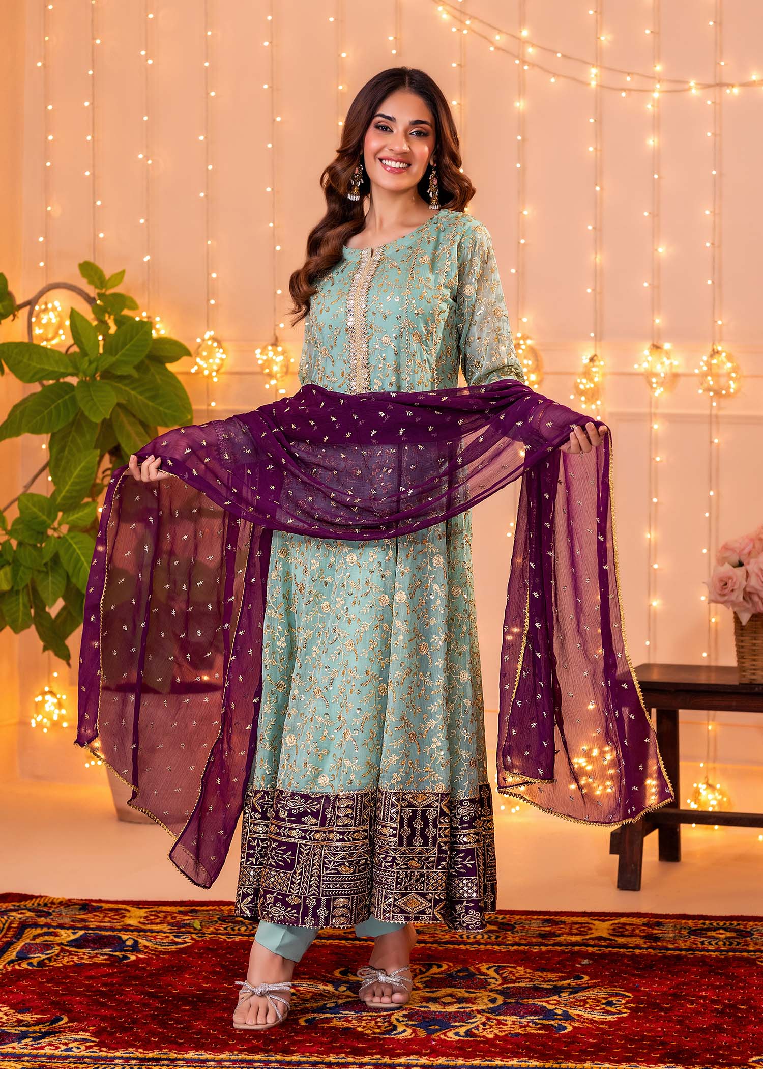 Gender:Â Womenn Category:Â Clothingn Outfit Type:Â Eastern Ready to wearn Sub-Category:Â Ghararan Bottom Style:Â Straight Leg Ghararan Color Type:Â Plumn Dupatta Fabrics:Â Chiffonn Number of Pieces:Â 3 Piece