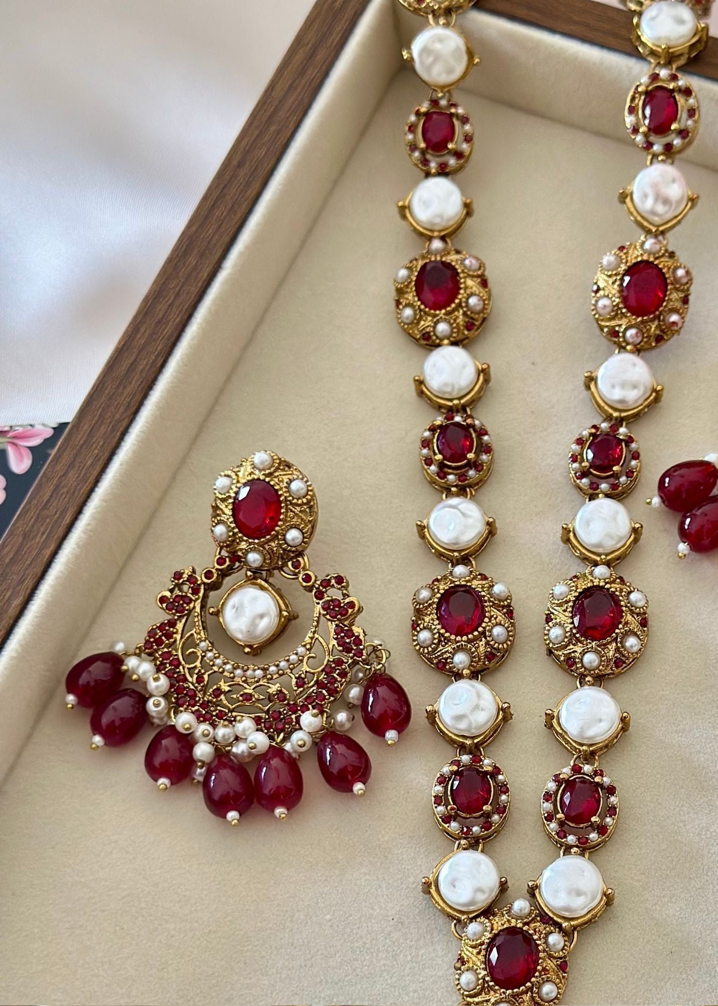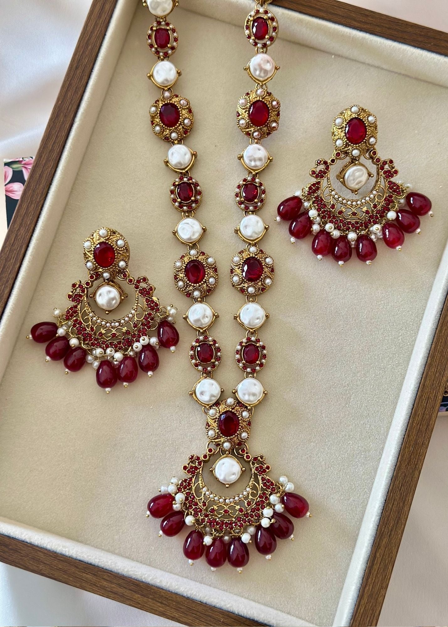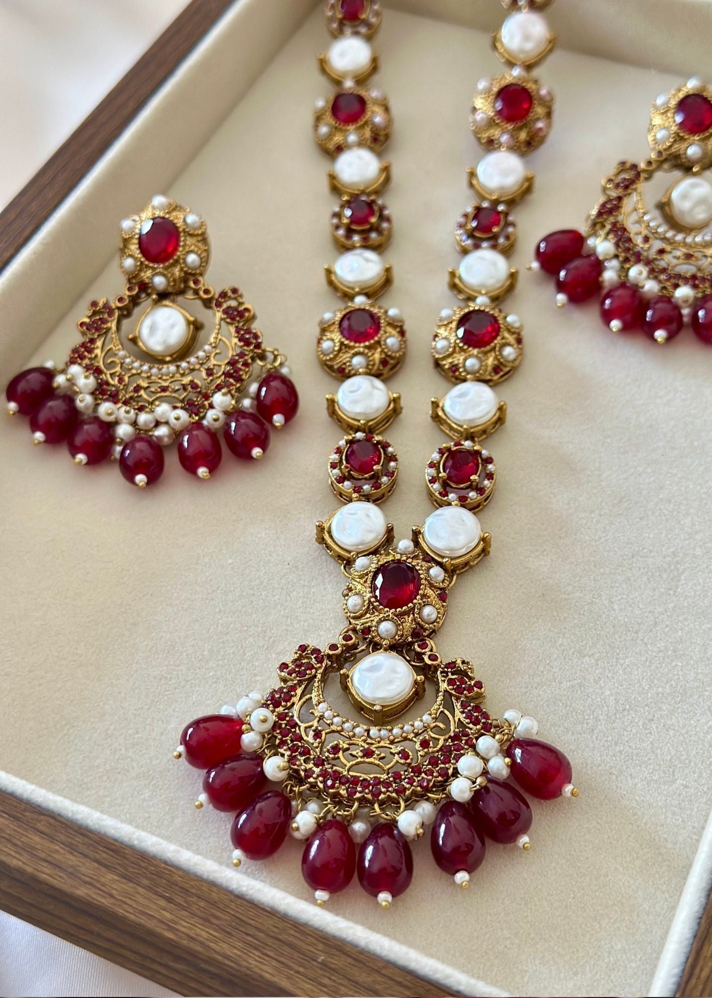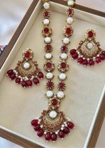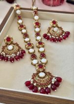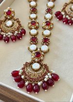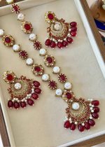 Additional Description:Â This magnificent jewelry set embodies the grandeur of traditional Turkish-inspired craftsmanship, featuring a lustrous gold-toned finish adorned with rich ruby red cabochon stones and radiant white pearls. The set includes an elaborate long necklace (maala) and substantial matching drop earrings, both showcasing intricate metalwork, accented with sparkling clear zircons and delicate dangling red beads and pearls. This piece reflects timeless elegance and a luxurious heritage.n