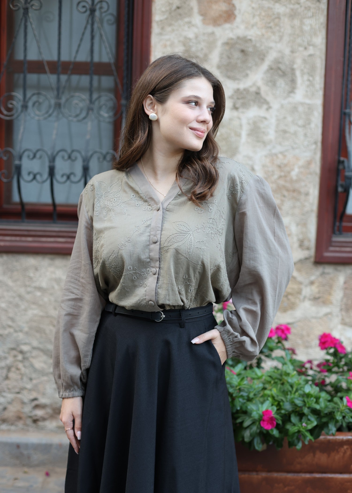 Additional Description:Â The shirt features delicate chikan kari embroidery, adding intricate detail to the soft fabric. The V-neckline and button-down front create a flattering silhouette, while the cuffed sleeves lend a touch of elegance. nnFabric: Embroidered Cottonn