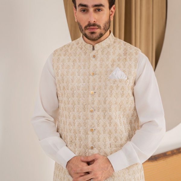 Gender:Â Menn Category:Â Clothingn Outfit Type:Â Easternn Sub-Category:Â Waistcoatn Color Type:Â Creamn Fabric:Â Raw Silkn Number of Pieces:Â 1 Piece – Outerwearn Product Type:Â Festive/Party Wearn Season:Â All Seasonn