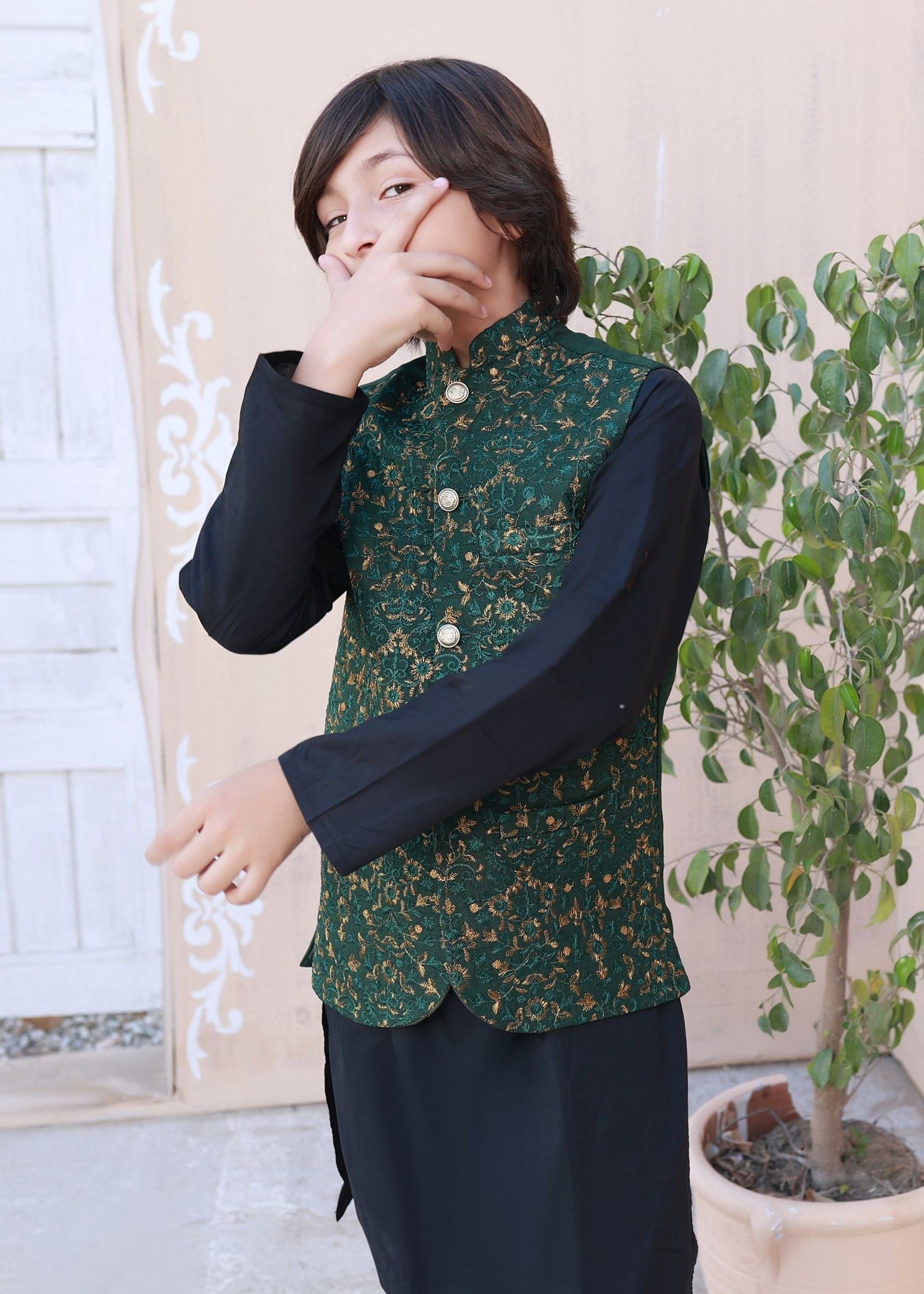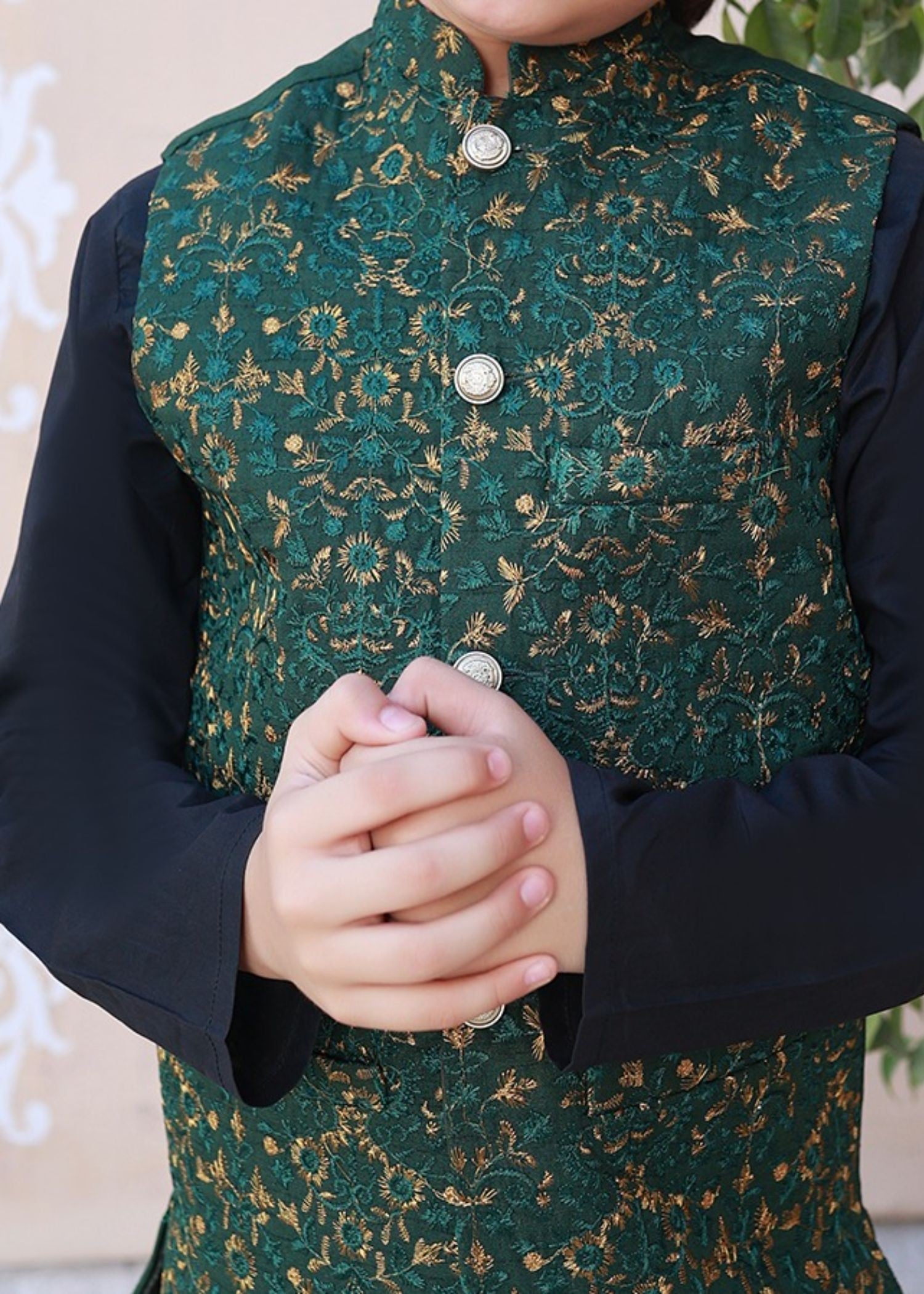 Additional Description:Â Includes Leaf Green embroidered waistcoat nHigh quality imported fabric waistcoatnFor boys 3 – 14 yearsn