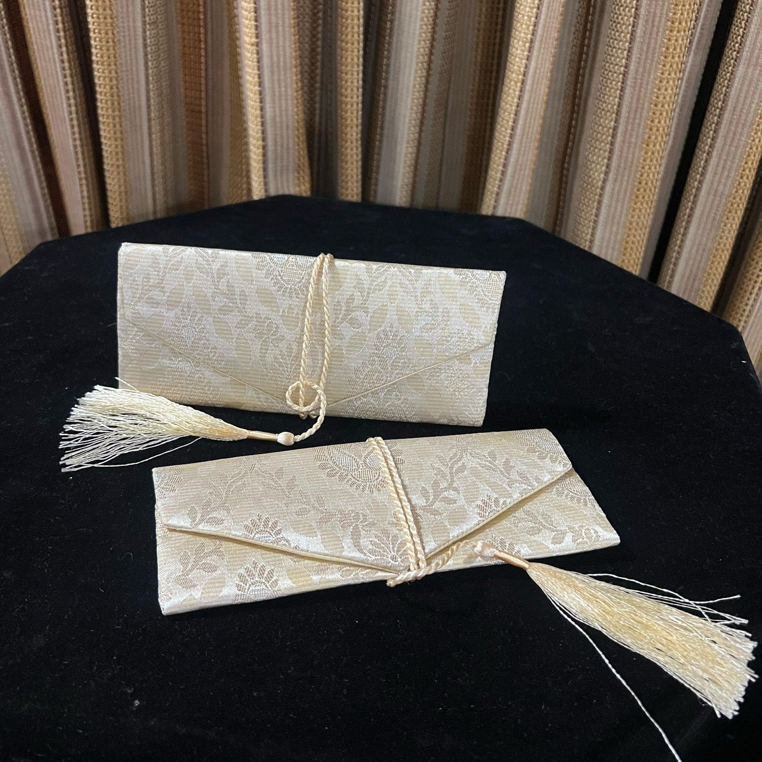Additional Description: Description:nnMake your special moments even more memorable with this beautifully crafted Jamawar Salami Envelope. Designed for weddings, Eid, and other festive occasions, this envelope is made from luxurious jamawar fabric that reflects tradition and elegance.nnFeatures:nnMade with high-quality jamawar fabricnnPerfect for gifting money (Salami, Eidi, etc.)nnSoft inner lining to keep cash or cards safennElegant and royal appearancennAvailable in various rich colors and traditional patternsnnIdeal for weddings, engagements, Eid, and other celebrationsnnUses:nnWedding Salami / Gift MoneynnEidi or festive giftingnnEvent giveaways with a touch of classnnTraditional envelopes for formal occasionsnnAdd a graceful touch to your gift with this beautiful jamawar envelope — where tradition meets elegance!n