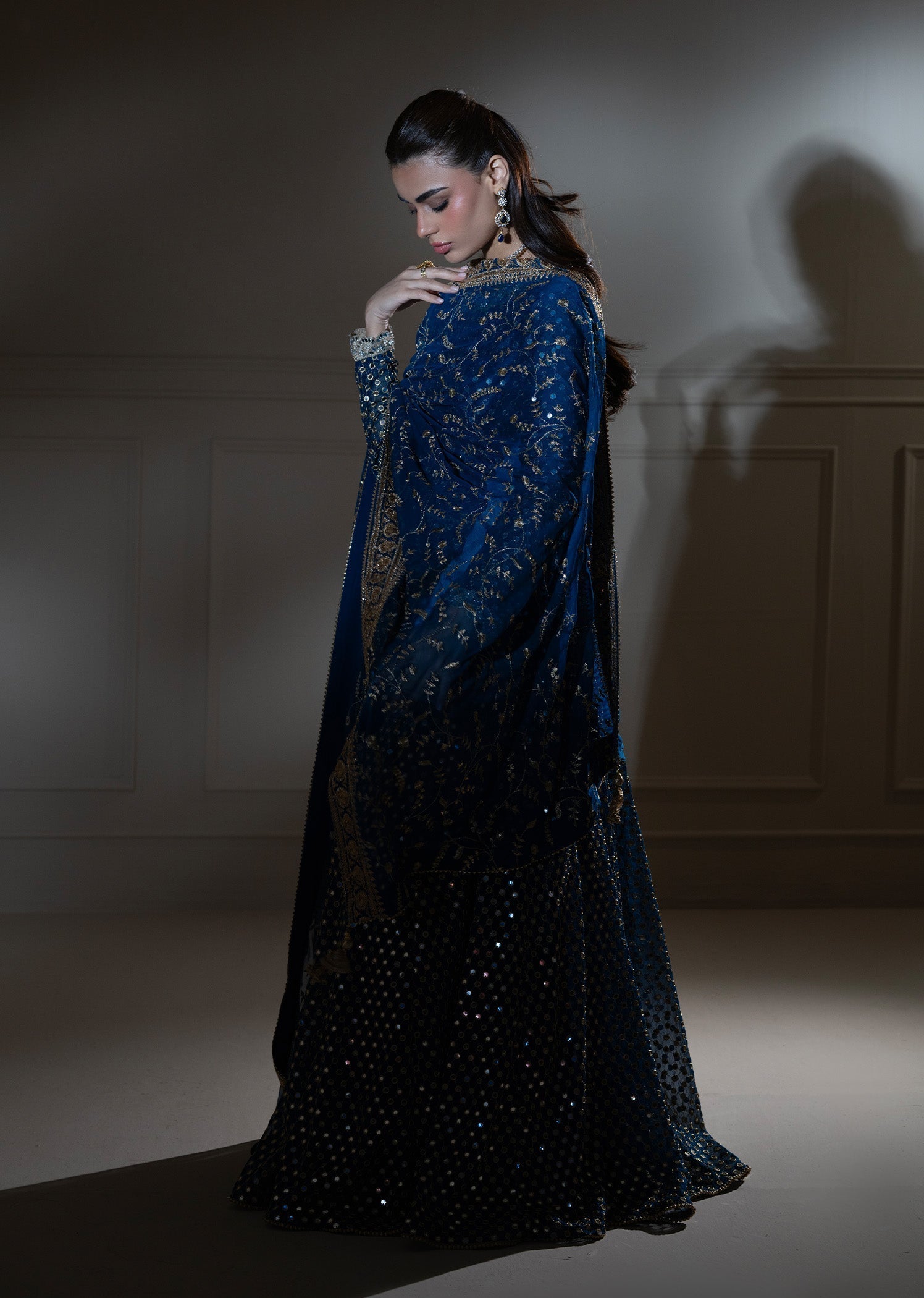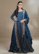 Gender:Â Womenn Category:Â Clothingn Outfit Type:Â Eastern Ready to wearn Sub-Category:Â Ghararan Bottom Style:Â Wide-Leg Ghararan Color Type:Â Dark Bluen Dupatta Fabrics:Â Chiffonn Number of Pieces:Â 3 Piece